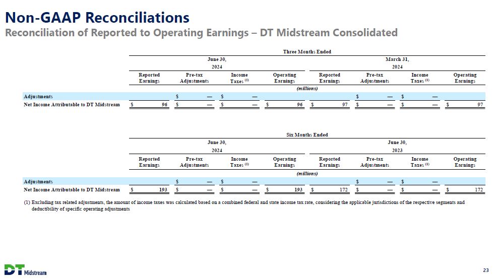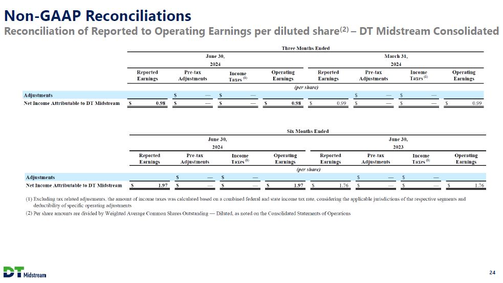 Non-GAAP Reconciliations Reconciliation of Reported to Operating Earnings - DT Midstream Consolidated Three Months Ended June 30, 2024 March 31, 2024 Reported Earnings Pre-tax Adjustments Income Taxes(1) Operating Earnings Reported Earnings Pre-tax Adjustments Income Taxes(1) Operating Earnings (millions) Adjustments $ - $ - $ - $ - Net Income Attributable to DT Midstream $96 $ - $ - $96 $97 $ - $ - $97 Six Months Ended June 30, 2024 June 30, 2023 Reported Earnings Pre-tax Adjustments Income Taxes(1) Operating Earnings Reported Earnings Pre-tax Adjustments Income Taxes(1) Operating Earnings (millions) Adjustments $ - $ - $ - $ - Net Income Attributable to DT Midstream $193 $ - $ - $193 $172 $ - $ - $172 (1) Excluding tax related adjustments, the amount of income taxes was calculated based on a combined federal and state income tax rate, considering the applicable jurisdictions of the respective segments and deductibility of specific operating adjustments DT Midstream 23