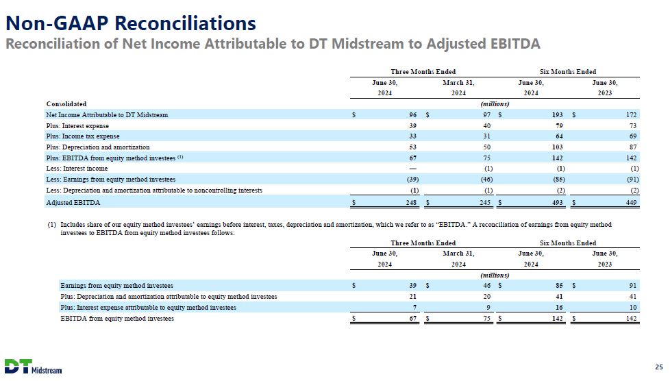 Non-GAAP Reconciliations Reconciliation of Net Income Attributable to DT Midstream to Adjusted EBITDA Three Months Ended Six Months Ended June 30, 2024 March 31, 2024 June 30, 2024 June 30, 2023 Consolidated (millions) Net Income Attributable to DT Midstream $96 $97 $193 $172 Plus: Interest expense 39 40 79 73 Plus: Income tax expense 33 31 64 69 Plus: EBITDA from equity method investees(1) 53 50 103 87 Less: Interest income - (1) (1) (1) Less: Earnings from equity method investees (39) (46) (85) (91) Less: Depreciation and amortization attributable to noncontrolling interests (1) (1) (2) (2) Adjusted EBITDA $248 $245 $493 $449 (1) Includes share of our equity method investees' earnings before interest, taxes, depreciation and amortization, which we refer to as "EBITDA." A reconciliation of earnings from equity method investees to EBITDA from equity method investees follows: Three Months Ended Six Months Ended June 30, 2024 March 31, 2024 June 30, 2024 June 30, 2023 (millions) Earnings from equity method investees $39 $46 $85 $91 Plus: Depreciation and amortization attributable to equity method investees 21 20 41 41 Plus: Interest expenses attributable to equity method investees 7 9 16 10 EBITDA from equity method investees $67 $75 $142 $142 DT Midstream 25