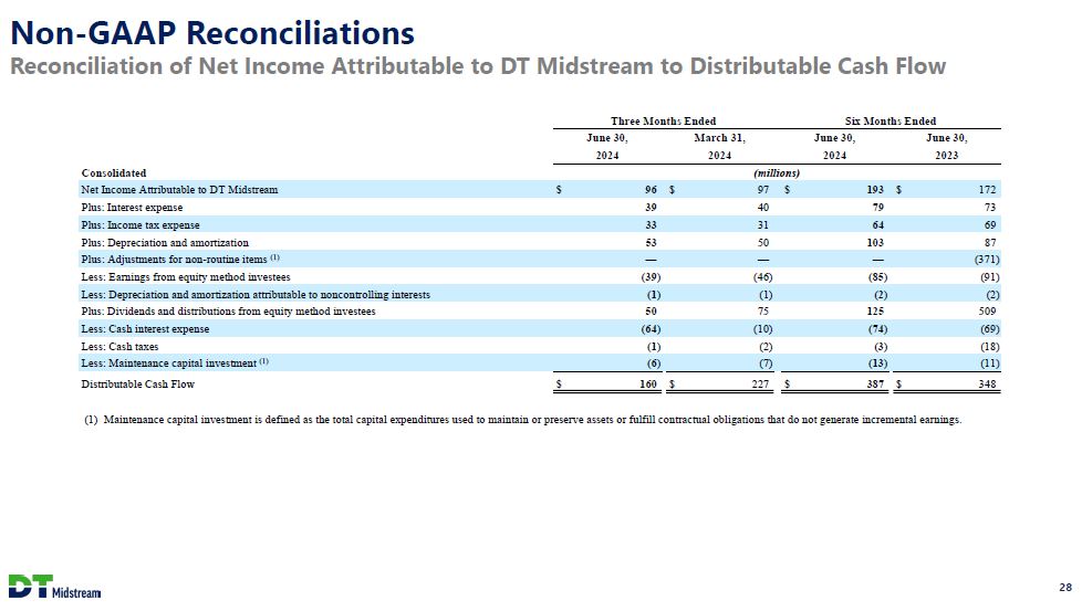 Non-GAAP Reconciliations Reconciliation of Net Income Attributable to DT Midstream to Adjusted EBITDA Gathering Segment Three Months Ended Six Months Ended June 30, 2024 March 31, 2024 June 30, 2024 June 30, 2023 Gathering (millions) Net Income Attributable to DT Midstream $25 $23 $48 $51 Plus: Interest expense 27 27 54 44 Plus: Income tax expense 9 7 16 20 Plus: Depreciation and amortization 34 32 66 54 Adjusted EBITDA $95 $89 $184 $169 DT Midstream 27
