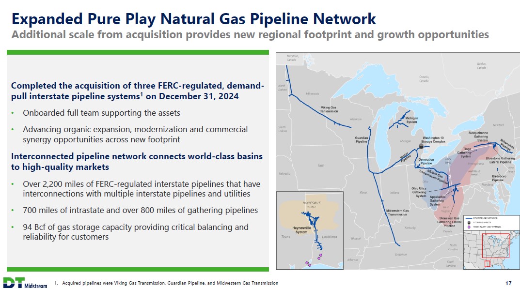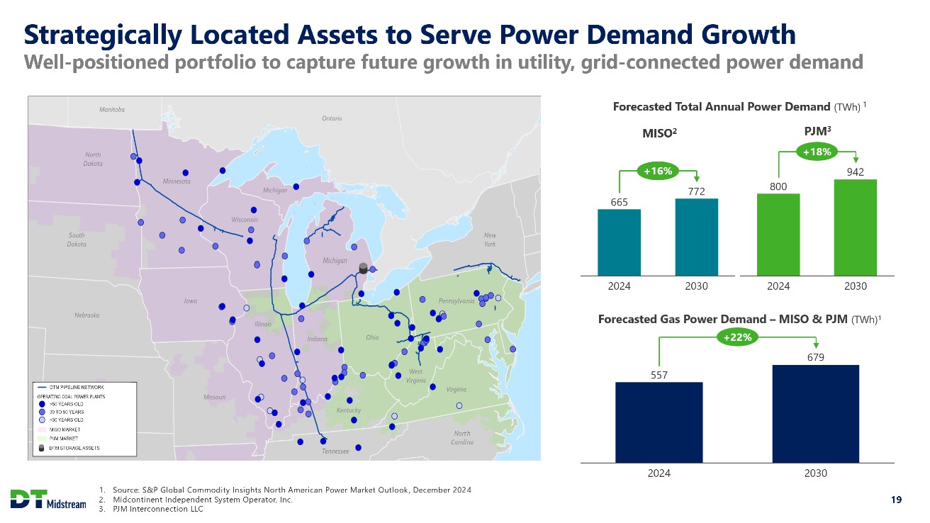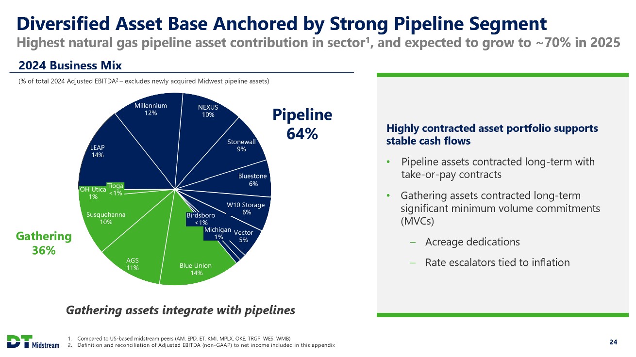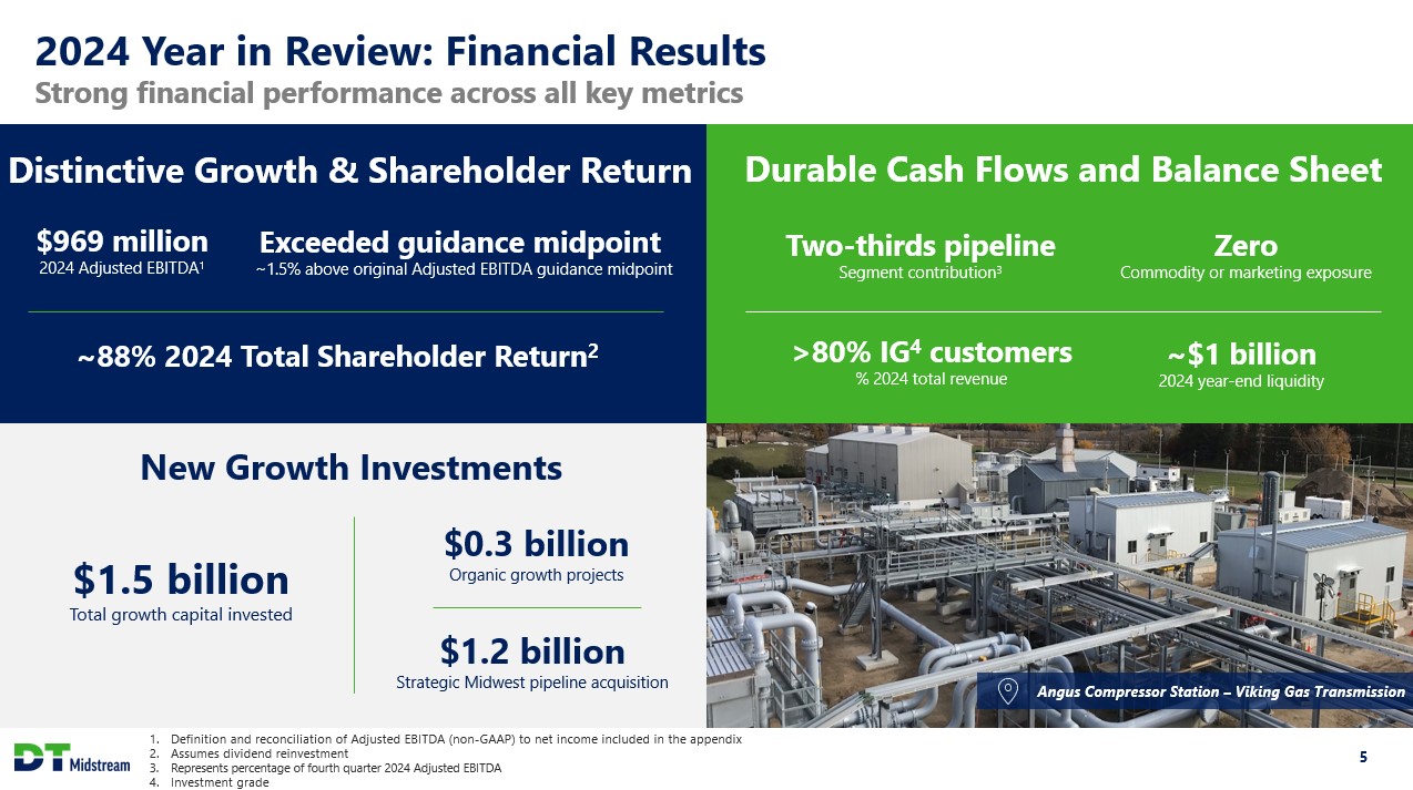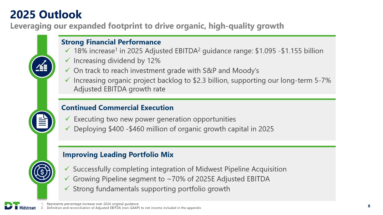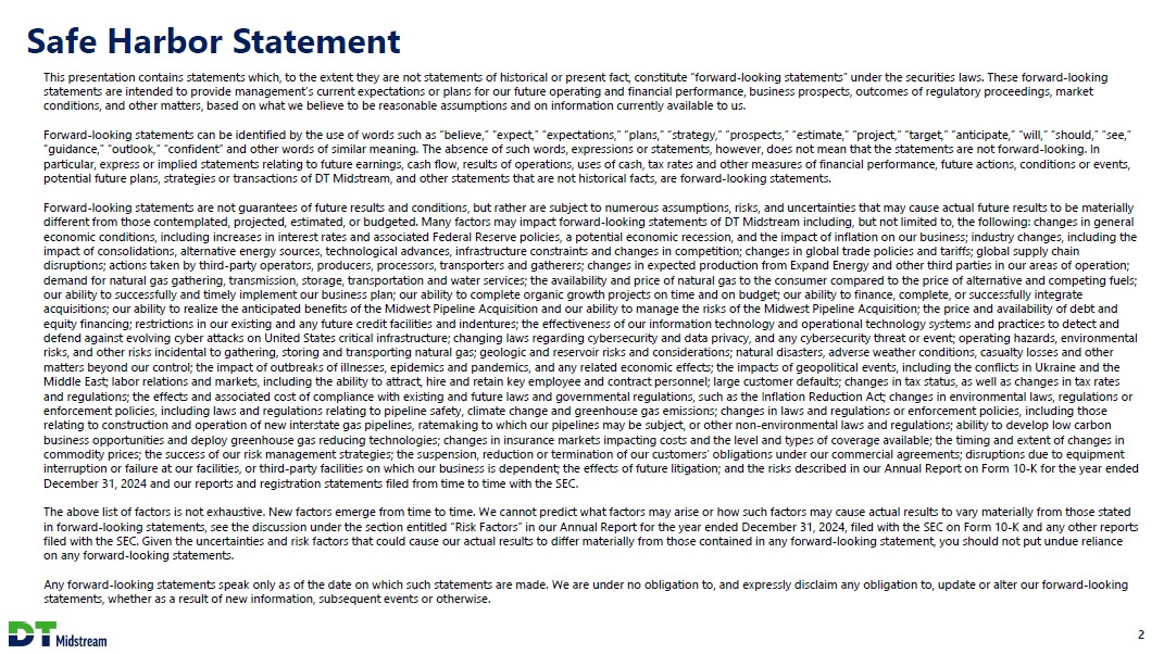 Safe Harbor Statement This presentation contains statements which, to the extent they are not statements of historical or present fact, constitute "forward-looking statements" under the securities laws. These forward-looking statements are intended to provide management's current expectations or plans for our future operating and financial performance, business prospects, outcomes of regulatory proceedings, market conditions, and other matters, based on what we believe to be reasonable assumptions and on information currently available to us. Forward-looking statements can be identified by the use of words such as "believe," "expect," "expectations," "plans," "strategy," "prospects," "estimate," "project," "target," "anticipate," "will," "should," "see," "guidance," "outlook," "confident" and other words of similar meaning. The absence of such words, expressions or statements, however, does not mean that the statements are not forward-looking. In particular, express or implied statements relating to future earnings, cash flow, results of operations, uses of cash, tax rates and other measures of financial performance, future actions, conditions or events, potential future plans, strategies or transactions of DT Midstream, and other statements that are not historical facts, are forward-looking statements. Forward-looking statements are not guarantees of future results and conditions, but rather are subject to numerous assumptions, risks, and uncertainties that may cause actual future results to be materially different from those contemplated, projected, estimated, or budgeted. Many factors may impact forward-looking statements of DT Midstream including, but not limited to, the following: changes in general economic conditions, including increases in interest rates and associated Federal Reserve policies, a potential economic recession, and the impact of inflation on our business; industry changes, including the impact of consolidations, alternative energy sources, technological advances, infrastructure constraints and changes in competition; changes in global trade policies and tariffs; global supply chain disruptions; actions taken by third-party operators, producers, processors, transporters and gatherers; changes in expected production from Expand Energy and other third parties in our areas of operation; demand for natural gas gathering, transmission, storage, transportation and water services; the availability and price of natural gas to the consumer compared to the price of alternative and competing fuels; our ability to successfully and timely implement our business plan; our ability to complete organic growth projects on time and on budget; our ability to finance, complete, or successfully integrate acquisitions; our ability to realize the anticipated benefits of the Midwest Pipeline Acquisition and our ability to manage the risks of the Midwest Pipeline Acquisition; the price and availability of debt and equity financing; restrictions in our existing and any future credit facilities and indentures; the effectiveness of our information technology and operational technology systems and practices to detect and defend against evolving cyber attacks on United States critical infrastructure; changing laws regarding cybersecurity and data privacy, and any cybersecurity threat or event; operating hazards, environmental risks, and other risks incidental to gathering, storing and transporting natural gas; geologic and reservoir risks and considerations; natural disasters, adverse weather conditions, casualty losses and other matters beyond our control; the impact of outbreaks of illnesses, epidemics and pandemics, and any related economic effects; the impacts of geopolitical events, including the conflicts in Ukraine and the Middle East; labor relations and markets, including the ability to attract, hire and retain key employee and contract personnel; large customer defaults; changes in tax status, as well as changes in tax rates and regulations; the effects and associated cost of compliance with existing and future laws and governmental regulations, such as the Inflation Reduction Act; changes in environmental laws, regulations or enforcement policies, including laws and regulations relating to pipeline safety, climate change and greenhouse gas emissions; changes in laws and regulations or enforcement policies, including those relating to construction and operation of new interstate gas pipelines, ratemaking to which our pipelines may be subject, or other non-environmental laws and regulations; ability to develop low carbon business opportunities and deploy greenhouse gas reducing technologies; changes in insurance markets impacting costs and the level and types of coverage available; the timing and extent of changes in commodity prices; the success of our risk management strategies; the suspension, reduction or termination of our customers' obligations under our commercial agreements; disruptions due to equipment interruption or failure at our facilities, or third-party facilities on which our business is dependent; the effects of future litigation; and the risks described in our Annual Report on Form 10-K for the year ended December 31, 2024 and our reports and registration statements filed from time to time with the SEC. The above list of factors is not exhaustive. New factors emerge from time to time. We cannot predict what factors may arise or how such factors may cause actual results to vary materially from those stated in forward-looking statements, see the discussion under the section entitled "Risk Factors" in our Annual Report for the year ended December 31, 2024, filed with the SEC on Form 10-K and any other reports filed with the SEC. Given the uncertainties and risk factors that could cause our actual results to differ materially from those contained in any forward-looking statement, you should not put undue reliance on any forward-looking statements. Any forward-looking statem