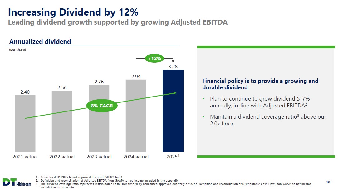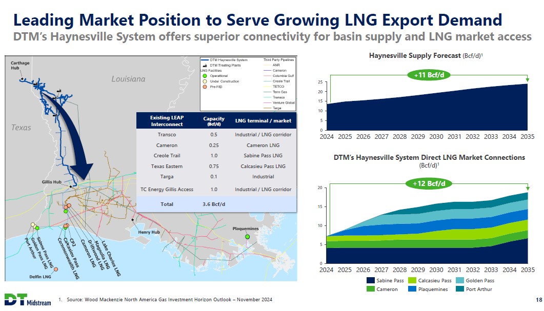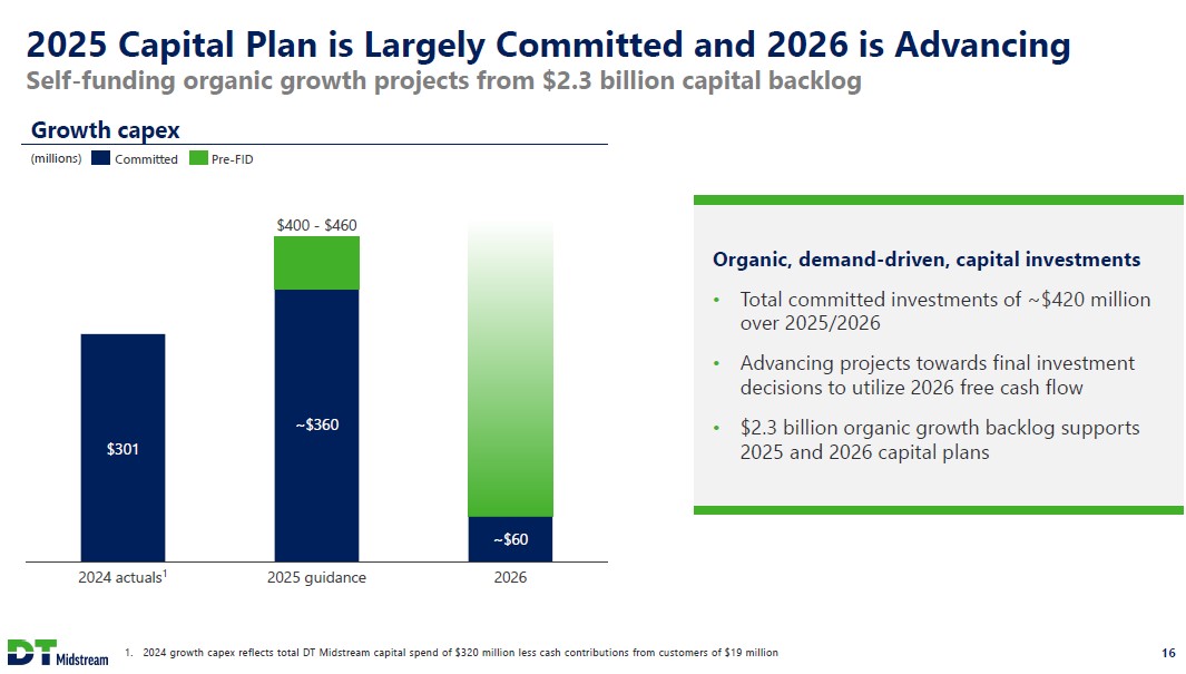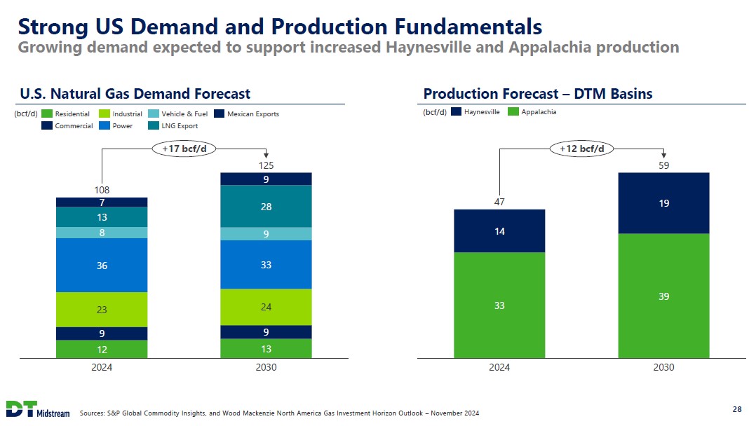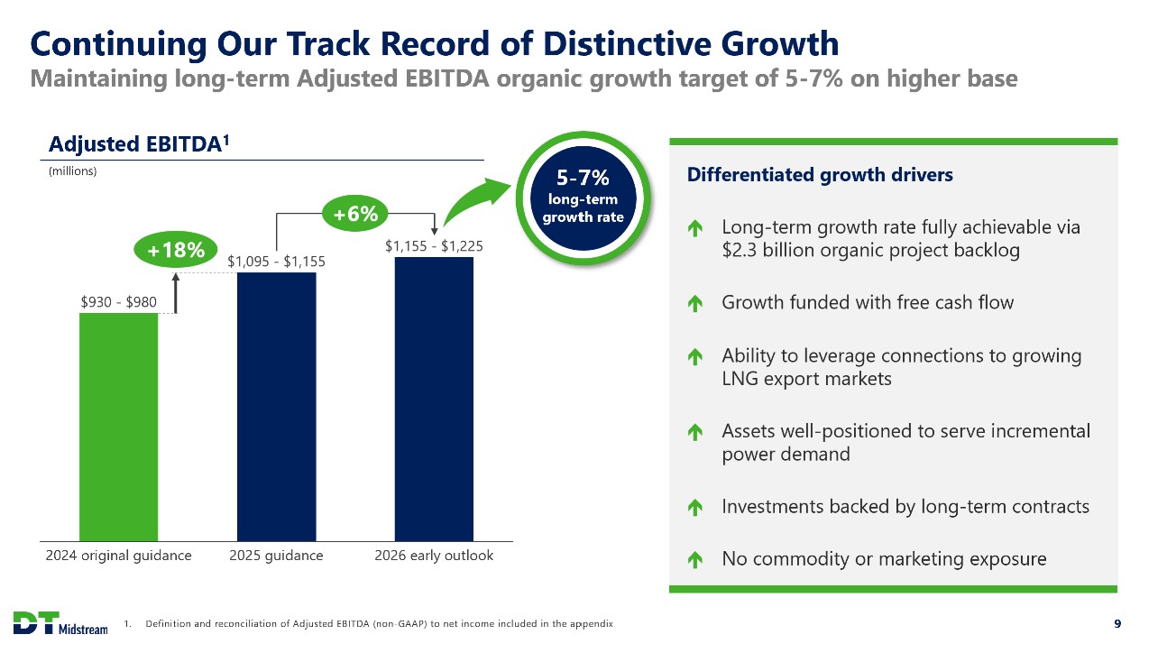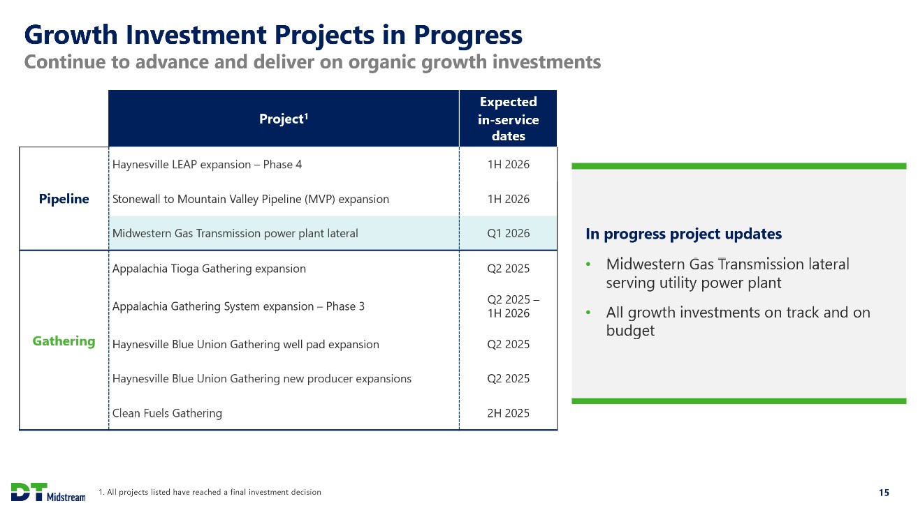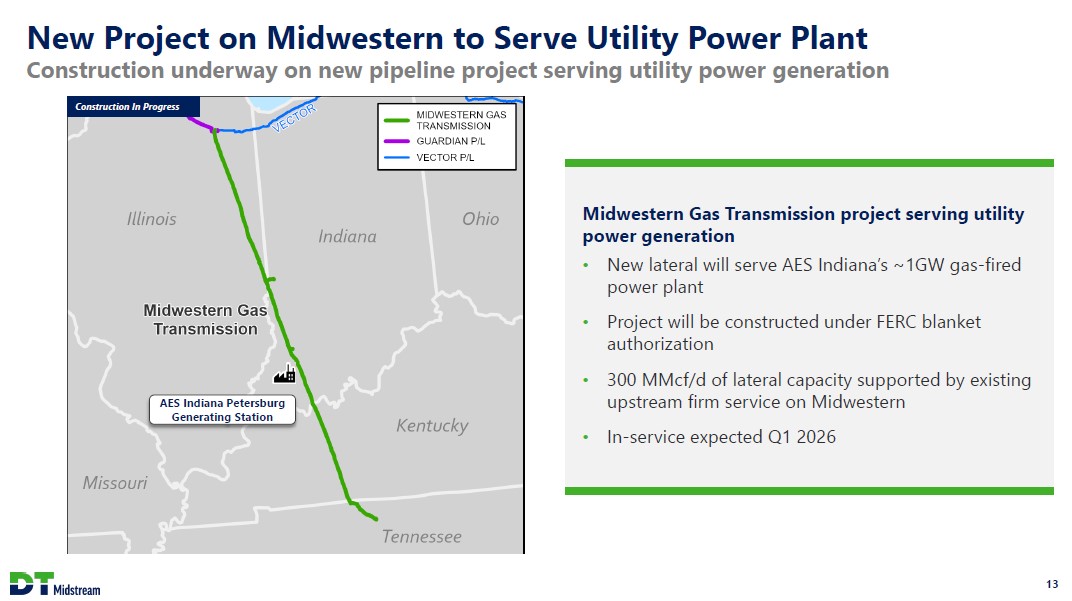 Safe Harbor Statement This presentation contains statements which, to the extent they are not statements of historical or present fact, constitute "forward-looking statements" under the securities laws. These forward-looking statements are intended to provide management's current expectations or plans for our future operating and financial performance, business prospects, outcomes of regulatory proceedings, market conditions, and other matters, based on what we believe to be reasonable assumptions and on information currently available to us. Forward-looking statements can be identified by the use of words such as "believe," "expect," "expectations," "plans," "strategy," "prospects," "estimate," "project," "target," "anticipate," "will," "should," "see," "guidance," "outlook," "confident" and other words of similar meaning. The absence of such words, expressions or statements, however, does not mean that the statements are not forward-looking. In particular, express or implied statements relating to future earnings, cash flow, results of operations, uses of cash, tax rates and other measures of financial performance, future actions, conditions or events, potential future plans, strategies or transactions of DT Midstream, and other statements that are not historical facts, are forward-looking statements. Forward-looking statements are not guarantees of future results and conditions, but rather are subject to numerous assumptions, risks, and uncertainties that may cause actual future results to be materially different from those contemplated, projected, estimated, or budgeted. Many factors may impact forward-looking statements of DT Midstream including, but not limited to, the following: changes in general economic conditions, including increases in interest rates and associated Federal Reserve policies, a potential economic recession, and the impact of inflation on our business; industry changes, including the impact of consolidations, alternative energy sources, technological advances, infrastructure constraints and changes in competition; changes in global trade policies and tariffs; global supply chain disruptions; actions taken by third-party operators, producers, processors, transporters and gatherers; changes in expected production from Expand Energy and other third parties in our areas of operation; demand for natural gas gathering, transmission, storage, transportation and water services; the availability and price of natural gas to the consumer compared to the price of alternative and competing fuels; our ability to successfully and timely implement our business plan; our ability to complete organic growth projects on time and on budget; our ability to finance, complete, or successfully integrate acquisitions; our ability to realize the anticipated benefits of the Midwest Pipeline Acquisition and our ability to manage the risks of the Midwest Pipeline Acquisition; the price and availability of debt and equity financing; restrictions in our existing and any future credit facilities and indentures; the effectiveness of our information technology and operational technology systems and practices to detect and defend against evolving cyber attacks on United States critical infrastructure; changing laws regarding cybersecurity and data privacy, and any cybersecurity threat or event; operating hazards, environmental risks, and other risks incidental to gathering, storing and transporting natural gas; geologic and reservoir risks and considerations; natural disasters, adverse weather conditions, casualty losses and other matters beyond our control; the impact of outbreaks of illnesses, epidemics and pandemics, and any related economic effects; the impacts of geopolitical events, including the conflicts in Ukraine and the Middle East; labor relations and markets, including the ability to attract, hire and retain key employee and contract personnel; large customer defaults; changes in tax status, as well as changes in tax rates and regulations; the effects and associated cost of compliance with existing and future laws and governmental regulations, such as the Inflation Reduction Act; changes in environmental laws, regulations or enforcement policies, including laws and regulations relating to pipeline safety, climate change and greenhouse gas emissions; changes in laws and regulations or enforcement policies, including those relating to construction and operation of new interstate gas pipelines, ratemaking to which our pipelines may be subject, or other non-environmental laws and regulations; ability to develop low carbon business opportunities and deploy greenhouse gas reducing technologies; changes in insurance markets impacting costs and the level and types of coverage available; the timing and extent of changes in commodity prices; the success of our risk management strategies; the suspension, reduction or termination of our customers' obligations under our commercial agreements; disruptions due to equipment interruption or failure at our facilities, or third-party facilities on which our business is dependent; the effects of future litigation; and the risks described in our Annual Report on Form 10-K for the year ended December 31, 2024 and our reports and registration statements filed from time to time with the SEC. The above list of factors is not exhaustive. New factors emerge from time to time. We cannot predict what factors may arise or how such factors may cause actual results to vary materially from those stated in forward-looking statements, see the discussion under the section entitled "Risk Factors" in our Annual Report for the year ended December 31, 2024, filed with the SEC on Form 10-K and any other reports filed with the SEC. Given the uncertainties and risk factors that could cause our actual results to differ materially from those contained in any forward-looking statement, you should not put undue reliance on any forward-looking statements. Any forward-looking statem
