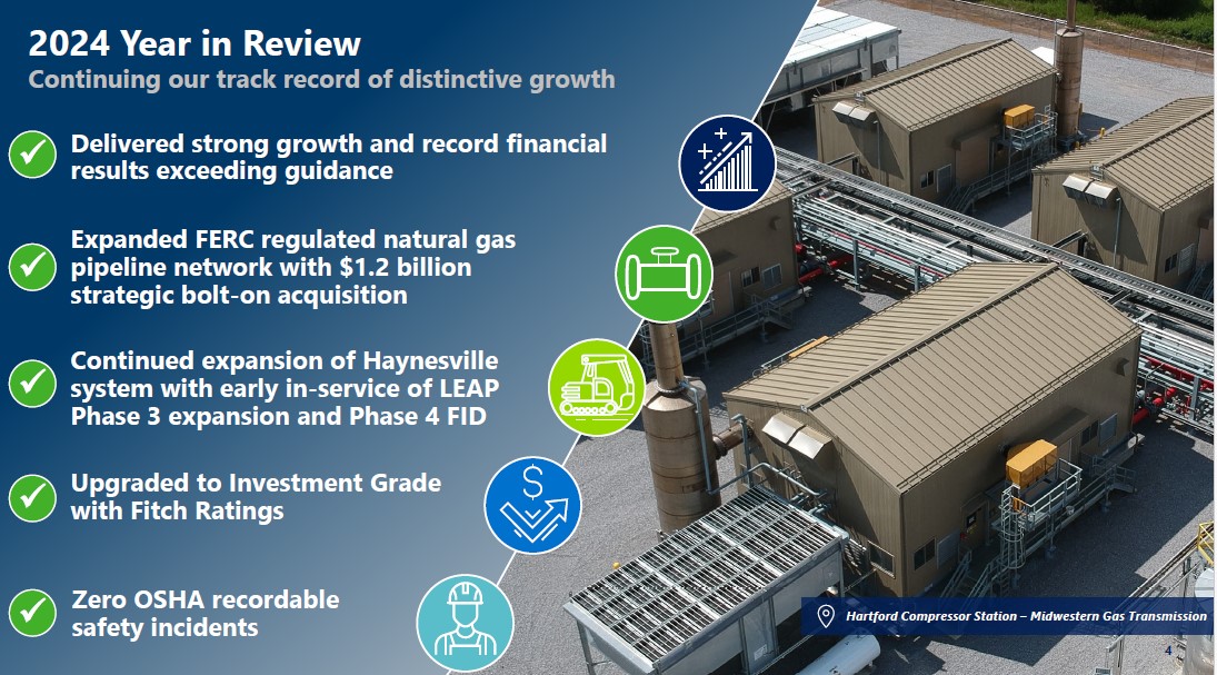 2024 Year in Review Continuing our track record of distinctive growth Delivered strong growth and record financial results exceeding guidance Expanded FERC regulated natural gas pipeline network with $1.2 billion strategic bolt-on acquisition Continued expansion of Haynesville system with early in-service of LEAP Phase 3 expansion and Phase 4 FID Upgraded to Investment Grade with Fitch Ratings Zero OSHA recordable safety incidents Hartford Compressor Station - Midwest Gas Transmission 4