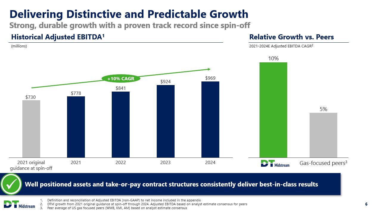 DTM Provides a Distinctive Investment Opportunity Premium, high-quality, pure play natural gas attributes compared to peers Leading Organic Growth 5-7% long-term Adjusted EBITDA growth rate Self-funded and supported by ~$2.3B organic project backlog Leading Portfolio Mix ~70% Pipeline segment Pure play natural gas focus Premier Geographic Presence Top tier markets and basins Positioned to benefit from rising LNG and power demand Durable Contracting ~95% demand-based contracts1 Resilient cash flow with ~7-year average2 contract tenor Strong Balance Sheet Investment grade rated by Fitch Positive outlook by S+P and Moody's Peer-leading Dividend and Adjusted EBITDA Growth Dividend increasing 12% in 2025 Dividend CAGR 2021-2025E Adjusted EBITDA5 CAGR 2021-2025E 8% 3% 10% 5% DTM3 Gas-Focused Peers4 DTM3 Gas-Focused Peers4 Increasing Pipeline Segment Contribution6 2021 Pipeline 55% Gathering 45% 2025E Pipeline ~70% Gathering ~30% 1. Represents % of 2024 revenue contribution comprised of demand, MVC or flowing gas/proved developed producing reserves 2. Overall portfolio weighted average contract tenor as of 12/31/2024, includes new Midwest pipeline acquisition portfolio whose anchor customers have renewal rights and have historically renewed 3. DTM 2025 dividend based on annualized Q1 2025 Board-approved dividend ($0.82/share); DTM 2025E Adjusted EBITDA based on midpoint of 2025 guidance range 4. Peer average of gas-focused peers (WMB, KMI, AM); 2025E values based on analyst estimate consensus 5. Definition and reconciliation of Adjusted EBITDA (non-GAAP) to net income included in the appendix 6. Represents Q4 2021 and 2025 expected Pipeline and Gathering segment Adjusted EBITDA contributions DTMidstream 3