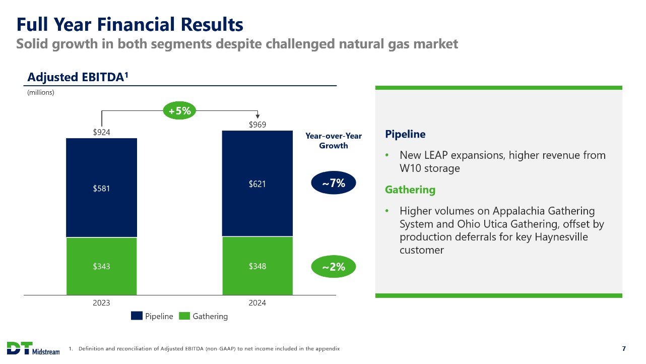 Delivering Distinctive and Predictable Growth Strong, durable growth with a proven track record since spin-off Historical Adjusted EBITDA1 (millions) +10% CAGR $730 $778 $841 $924 $969 2021 original guidance at spin-off 2021 2022 2023 2024 Relative Growth vs. Peers 2021-2024E Adjusted EBITDA CAGR2 10% 5% DTMidstream Peer average3 Well positioned assets and take-or-pay contract structures consistently deliver best-in-class results DTMidstream Gas-focused peers3 1. Definition and reconciliation of Adjusted EBITDA (non-GAAP) to net income included in the appendix 2. DTM growth from 2021 original guidance at spin-off through 2024. 2024 Adjusted EBITDA based on analyst estimate consensus for peers 3. Peer average of US gas focused peers (WMB, KMI, AM) based on analyst estimate consensus 6