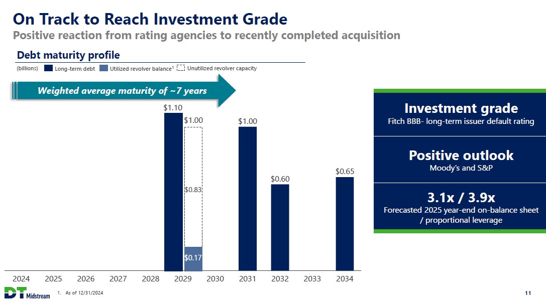 On Track to Reach Investment Grade Positive reaction from rating agencies to recently completed acquisition Debt maturity profile (billions) Long-term debt Utilized revolver balance1 Unutilized revolver capacity Weighted average maturity of ~7 years 2024 2025 2026 2027 2028 $1.10 $1.00 $0.83 $0.17 2029 2030 $1.00 2031 $0.60 2032 2033 $0.65 2034 Investment grade Fitch BBB- long-term issuer default rating Positive outlook Moody's and S+P 3.1x / 3.9x Forecasted 2025 year-end on-balance sheet / proportional leverage DTMidstream 1. As of 12/31/2024 11