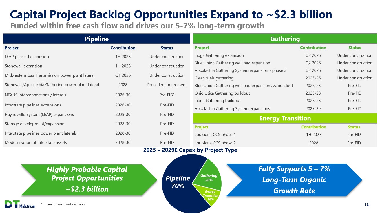 Capital Project Backlog Opportunities Expand to ~$2.3 billion Funded within free cash flow and drives our 5-7% long-term growth Pipeline Project LEAP phase 4 expansion Stonewall expansion Midwestern Gas Transmission power plant lateral Stonewall/Appalachia Gathering power plant lateral NEXUS interconnections / laterals Interstate pipelines expansions Haynesville System (LEAP) expansions Storage development/expansion Interstate pipelines power plant laterals Modernization of interstate assets Contribution 1H 2026 1H 2026 Q1 2026 2028 2026-30 2026-30 2028-30 2028-30 2028-30 2028-30 Status Under construction Under construction Under construction Precedent agreement Pre-FID^1 Pre-FID Pre-FID Pre-FID Pre-FID Pre-FID Gathering Project Tioga Gathering expansion Blue Union Gathering well pad expansion Appalachia Gathering System expansion - phase 3 Clean fuels gathering Blue Union Gathering well pad expansions & buildout Ohio Utica Gathering buildout Tioga Gathering buildout Appalachia Gathering System expansions Contribution Q2 2025 Q2 2025 Q2 2025 2025-26 2026-28 2025-28 2026-28 2027-30 Status Under construction Under construction Under construction Under construction Pre-FID Pre-FID Pre-FID Pre-FID Energy Transition Project Louisiana CCS phase 1 Louisiana CCS phase 2 Contribution 1H 2027 2028 Status Pre-FID Pre-FID 2025 - 2029E Capex by Project Type Highly Probable Capital Project Opportunities ~$2.3 billion Pipeline 70% Gathering 20% Energy Transition 10% Fully Supports 5 - 7% Long-Term Organic Growth Rate DTMidstream 1. Final investment decision 12