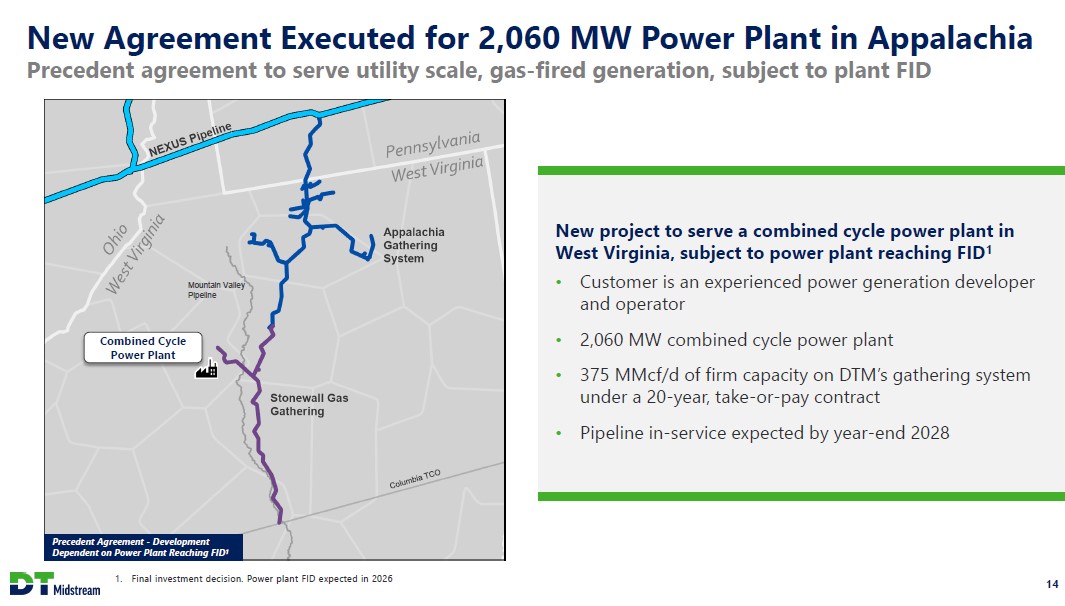 New Project on Midwestern to Serve Utility Power Plant Construction underway on new pipeline project serving utility power generation Construction In Progress Illinois Indiana Ohio Missouri Kentucky Tennessee Midwestern Gas Transmission AES Indiana Petersburg Generating Station MIDWESTERN GAS TRANSMISSION GUARDIAN P/L VECTORP/L Midwestern Gas Transmission project serving utility power generation New lateral will serve AES Indiana's ~1GW gas-fired power plant Project will be constructed under FERC blanket authorization 300 MMcf/d of lateral capacity supported by existing upstream firm service on Midwestern In-service expected Q1 2026 DTMidstream 13