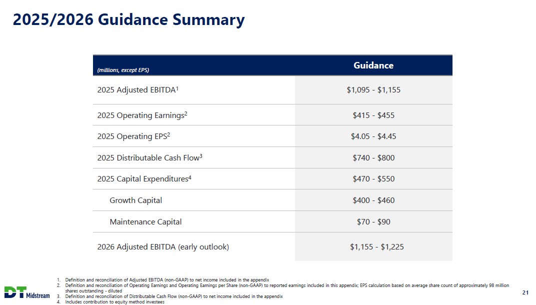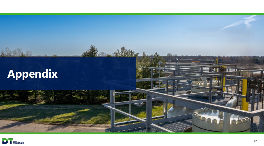 2025/2026 Guidance Summary (millions, except EPS) 2025 Adjusted EBITDA1 2025 Operating Earnings2 2025 Operating EPS2 2025 Distributable Cash Flow3 2025 Capital Expenditures4 Growth Capital Maintenance Capital 2026 Adjusted EBITDA (early outlook) Guidance $1,095 - $1,155 $415 - $455 $4.05 - $4.45 $740 - $800 $470 - $550 $400 - $460 $70 - $90 $1,155 - $1,225 1. Definition and reconciliation of Adjusted EBITDA (non-GAAP) to net income included in the appendix 2. Definition and reconciliation of Operating Earnings and Operating Earnings per Share (non-GAAP) to reported earnings included in this appendix; EPS calculation based on average share count of approximately 98 million shares outstanding - diluted 3. Definition and reconciliation of Distributable Cash Flow (non-GAAP) to net income included in the appendix 4. Includes contribution to equity method investees DTMidstream 21
