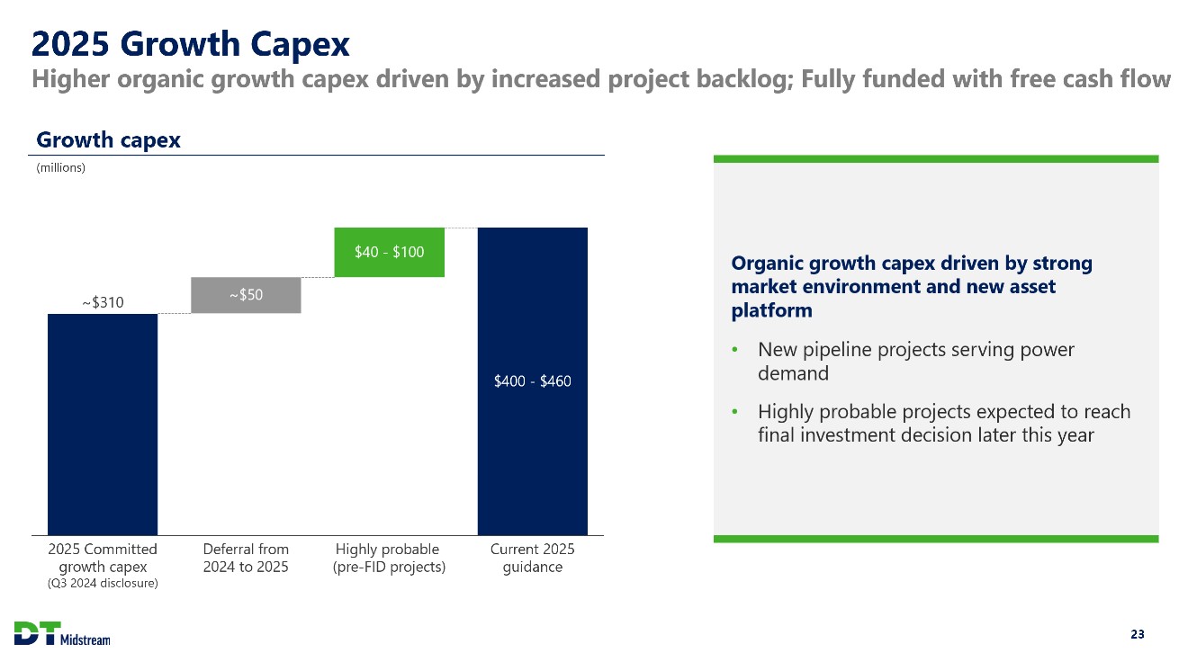 2025 Growth Capex Higher organic growth capex driven by increased project backlog; Fully funded with free cash flow Growth capex (millions) ~$310 2025 Committed growth capex (Q3 2024 disclosure) ~$50 Deferral from 2024 to 2025 $40 - $100 Highly probable (pre-FID projects) $400 - $460 Current 2025 guidance Organic growth capex driven by strong market environment and new asset platform New pipeline projects serving power demand Highly probable projects expected to reach final investment decision later this year DTMidstream 23