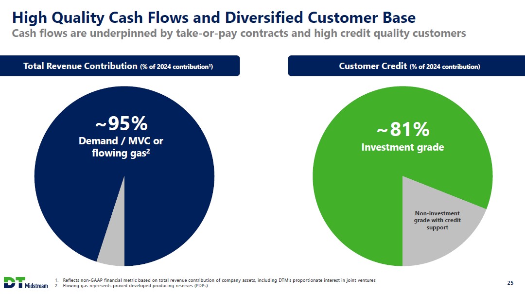 Diversified Asset Base Anchored by Strong Pipeline Segment Highest natural gas pipeline asset contribution in sector1, and expected to grow to ~70% in 2025 2024 Business Mix (% of total 2024 Adjusted EBITDA2 - excludes newly acquired Midwest pipeline assets) Millennium 12% NEXUS 10% Stonewall 9% Bluestone 6% W10 Storage 6% Vector 5% Michigan 1% Birdsboro <1% Blue Union 14% AGS 11% Susquehanna 10% OH Utica 1% Tioga <1% LEAP 14% Gathering 36% Pipeline 64% Gathering assets integrate with pipelines Highly contracted asset portfolio supports stable cash flows Pipeline assets contracted long-term with take-or-pay contracts Gathering assets contracted long-term significant minimum volume commitments (MVCs) Acreage dedications Rate escalators tied to inflation 1. Compared to US-based midstream peers (AM, EPD, ET, KMI, MPLX, OKE, TRGP, WES, WMB) 2. Definition and reconciliation of Adjusted EBITDA (non-GAAP) to net income included in this appendix DTMidstream 24