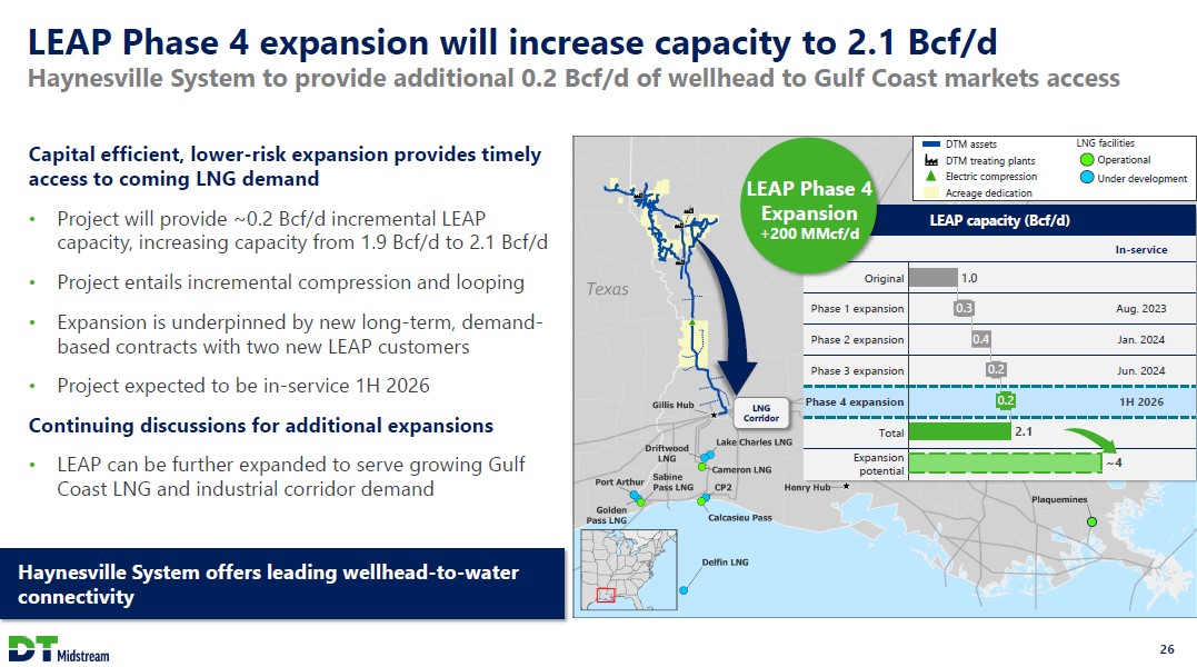 LEAP Phase 4 expansion will increase capacity to 2.1 Bcf/d Haynesville System to provide additional 0.2 Bcf/d of wellhead to Gulf Coast markets access Capital efficient, lower-risk expansion provides timely access to coming LNG demand Project will provide ~0.2 Bcf/d incremental LEAP capacity, increasing capacity from 1.9 Bcf/d to 2.1 Bcf/d Project entails incremental compression and looping Expansion is underpinned by new long-term, demand-based contracts with two new LEAP customers Project expected to be in-service 1H 2026 Continuing discussions for additional expansions LEAP can be further expanded to serve growing Gulf Coast LNG and industrial corridor demand Haynesville System offers leading wellhead-to-water connectivity LEAP Phase 4 Expansion +200 MMcf/d Texas Gillis Hub Driftwood LNG Port Arthur Sabine Pass LNG Golden Pass LNG LNG Corridor Lake Charles LNG Cameron LNG CP2 Calcasieu Pass Delfin LNG DTM assets DTM treating plants Electric compression Acreage dedication LNG facilities Operational Under development LEAP capacity (Bcf/d) In-service Original Phase 1 expansion Phase 2 expansion Phase 3 expansion Phase 4 expansion Total Expansion potential Henry Hub 1.0 0.3 0.4 0.2 0.2 2.1 ~4 Plaquemines Aug. 2023 Jan. 2024 Jun. 2024 1H 2026 DTMidstream 26