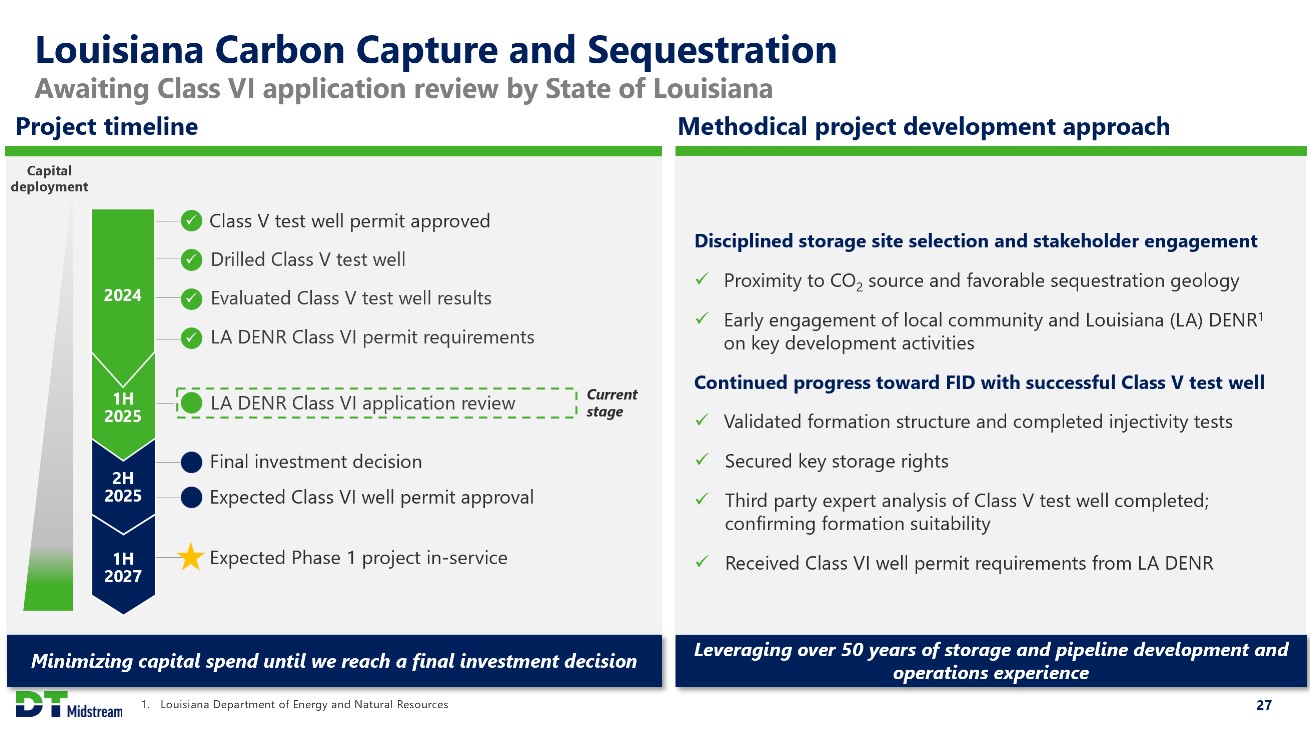 Louisiana Carbon Capture and Sequestration Awaiting Class VI application review by State of Louisiana Project timeline Capital deployment 2024 1H 2025 2H 2025 1H 2027 Class V test well permit approved Drilled Class V test well Evaluated Class V test well results LA DENR Class VI permit requirements LA DENR Class VI application review Final investment decision Expected Class VI well permit approval Expected Phase 1 project in-service Minimizing capital spend until we reach a final investment decision Methodical project development approach Disciplined storage site selection and stakeholder engagement Proximity to CO2 source and favorable sequestration geology Early engagement of local community and Louisiana (LA) DENR1 on key development activities Continued progress toward FID with successful Class V test well Validated formation structure and completed injectivity tests Secured key storage rights Third party expert analysis of Class V test well completed; confirming formation suitability Received Class VI well permit requirements from LA DENR Leveraging over 50 years of storage and pipeline development and operations experience 1. Louisiana Department of Energy and Natural Resources DTMidstream 27