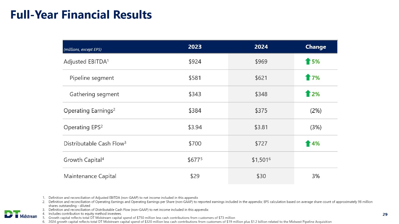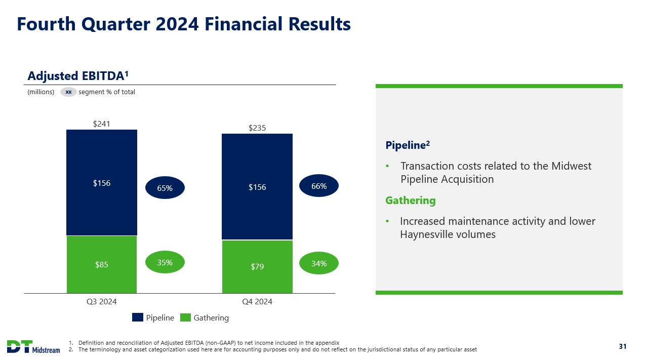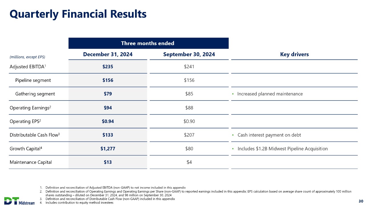 Operating EPS2 Quarterly Financial Results Three months ended (millions, except EPS) Adjusted EBITDA1 Pipeline segment Gathering segment Operating Earnings2 Distributable Cash Flow3 Growth Capital4 Maintenance Capital December 31, 2024 $235 $156 $79 $94 $0.94 $133 $1,277 $13 September 30, 2024 $241 $156 $85 $88 $0.90 $207 $80 $4 Key drivers Increased planned maintenance Cash interest payment on debt Includes $1.2B Midwest Pipeline Acquisition 1. Definition and reconciliation of Adjusted EBITDA (non-GAAP) to net income included in this appendix 2. Definition and reconciliation of Operating Earnings and Operating Earnings per Share (non-GAAP) to reported earnings included in this appendix; EPS calculation based on average share count of approximately 100 million shares outstanding - diluted on December 31, 2024, and 98 million on September 30, 2024 3. Definition and reconciliation of Distributable Cash Flow (non-GAAP) included in this appendix 4. Includes contribution to equity method investees DTMidstream 30