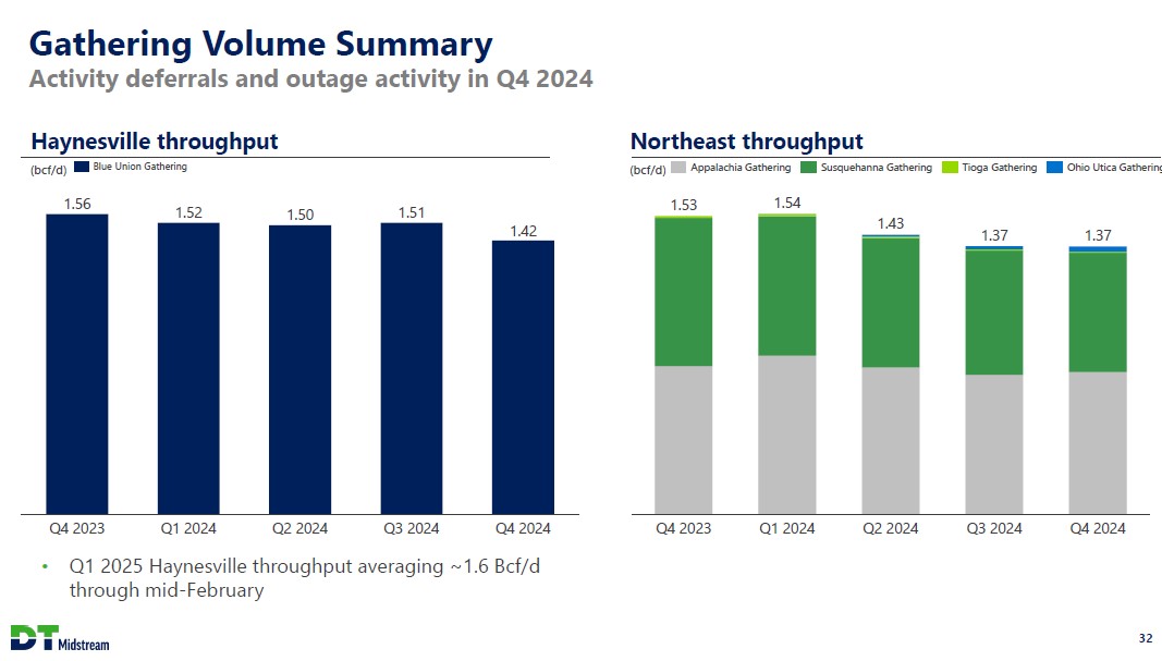 Fourth Quarter 2024 Financial Results Adjusted EBITDA1 (millions) xx segment % of total $241 $156 $85 Q3 2024 Pipeline 65% 35% $235 $156 $79 Q4 2024 66% 34% Pipeline2 Transaction costs related to the Midwest Pipeline Acquisition Gathering Increased maintenance activity and lower Haynesville volumes 1. Definition and reconciliation of Adjusted EBITDA (non-GAAP) to net income included in the appendix 2. The terminology and asset categorization used here are for accounting purposes only and do not reflect on the jurisdictional status of any particular asset DTMidstream 31