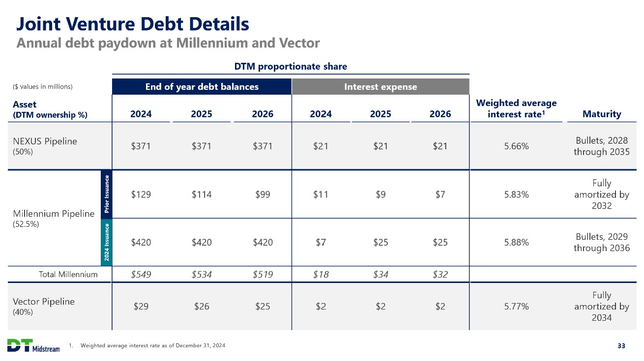 Joint Venture Debt Details Annual debt paydown at Millennium and Vector ($ values in millions) DTM proportionate share End of year debt balances Asset (DTM ownership %) NEXUS Pipeline (50%) Millennium Pipeline (52.5%) 2024 Issuance Prior Issuance Total Millennium Vector Pipeline (40%) 2024 $371 $129 $420 $549 $29 2025 $371 $114 $420 $534 $26 2026 $371 $99 $420 $519 $25 Interest expense 2024 $21 $11 $7 $18 $2 2025 $21 $9 $25 $34 $2 2026 $21 $7 $25 $32 $2 Weighted average interest rate1 5.66% 5.83% 5.88% 5.77% Maturity Bullets, 2028 through 2035 Fully amortized by 2032 Bullets, 2029 through 2036 Fully amortized by 2034 1. Weighted average interest rate as of December 31, 2024 DTMidstream 33