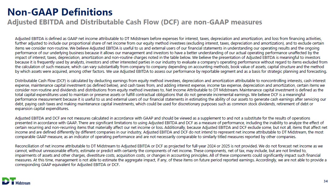Non-GAAP Definitions Adjusted EBITDA and Distributable Cash Flow (DCF) are non-GAAP measures Adjusted EBITDA is defined as GAAP net income attributable to DT Midstream before expenses for interest, taxes, depreciation and amortization, and loss from financing activities, further adjusted to include our proportional share of net income from our equity method investees (excluding interest, taxes, depreciation and amortization), and to exclude certain items we consider non-routine. We believe Adjusted EBITDA is useful to us and external users of our financial statements in understanding our operating results and the ongoing performance of our underlying business because it allows our management and investors to have a better understanding of our actual operating performance unaffected by the impact of interest, taxes, depreciation, amortization and non-routine charges noted in the table below. We believe the presentation of Adjusted EBITDA is meaningful to investors because it is frequently used by analysts, investors and other interested parties in our industry to evaluate a company's operating performance without regard to items excluded from the calculation of such measure, which can vary substantially from company to company depending on accounting methods, book value of assets, capital structure and the method by which assets were acquired, among other factors. We use Adjusted EBITDA to assess our performance by reportable segment and as a basis for strategic planning and forecasting. Distributable Cash Flow (DCF) is calculated by deducting earnings from equity method investees, depreciation and amortization attributable to noncontrolling interests, cash interest expense, maintenance capital investment (as defined below), and cash taxes from, and adding interest expense, income tax expense, depreciation and amortization, certain items we consider non-routine and dividends and distributions from equity method investees to, Net Income Attributable to DT Midstream. Maintenance capital investment is defined as the total capital expenditures used to maintain or preserve assets or fulfill contractual obligations that do not generate incremental earnings. We believe DCF is a meaningful performance measurement because it is useful to us and external users of our financial statements in estimating the ability of our assets to generate cash earnings after servicing our debt, paying cash taxes and making maintenance capital investments, which could be used for discretionary purposes such as common stock dividends, retirement of debt or expansion capital expenditures. Adjusted EBITDA and DCF are not measures calculated in accordance with GAAP and should be viewed as a supplement to and not a substitute for the results of operations presented in accordance with GAAP. There are significant limitations to using Adjusted EBITDA and DCF as a measure of performance, including the inability to analyze the effect of certain recurring and non-recurring items that materially affect our net income or loss. Additionally, because Adjusted EBITDA and DCF exclude some, but not all, items that affect net income and are defined differently by different companies in our industry, Adjusted EBITDA and DCF do not intend to represent net income attributable to DT Midstream, the most comparable GAAP measure, as an indicator of operating performance and are not necessarily comparable to similarly titled measures reported by other companies. Reconciliation of net income attributable to DT Midstream to Adjusted EBITDA or DCF as projected for full-year 2024 or 2025 is not provided. We do not forecast net income as we cannot, without unreasonable efforts, estimate or predict with certainty the components of net income. These components, net of tax, may include, but are not limited to, impairments of assets and other charges, divestiture costs, acquisition costs, or changes in accounting principles. All of these components could significantly impact such financial measures. At this time, management is not able to estimate the aggregate impact, if any, of these items on future period reported earnings. Accordingly, we are not able to provide a corresponding GAAP equivalent for Adjusted EBITDA or DCF. DTMidstream 34