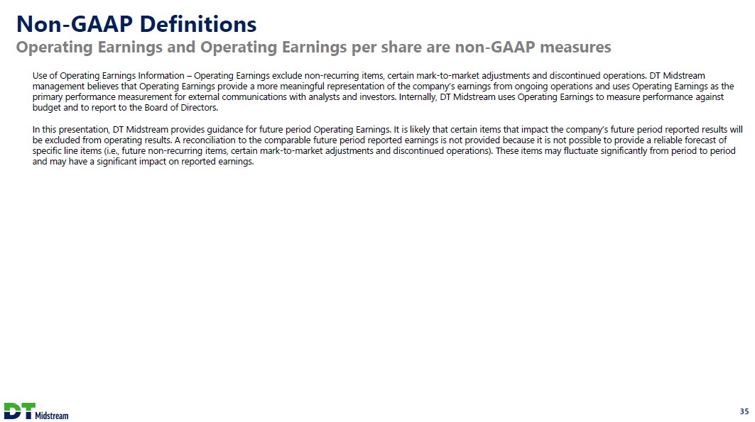 Non-GAAP Definitions Operating Earnings and Operating Earnings per share are non-GAAP measures Use of Operating Earnings Information - Operating Earnings exclude non-recurring items, certain mark-to-market adjustments and discontinued operations. DT Midstream management believes that Operating Earnings provide a more meaningful representation of the company's earnings from ongoing operations and uses Operating Earnings as the primary performance measurement for external communications with analysts and investors. Internally, DT Midstream uses Operating Earnings to measure performance against budget and to report to the Board of Directors. In this presentation, DT Midstream provides guidance for future period Operating Earnings. It is likely that certain items that impact the company's future period reported results will be excluded from operating results. A reconciliation to the comparable future period reported earnings is not provided because it is not possible to provide a reliable forecast of specific line items (i.e., future non-recurring items, certain mark-to-market adjustments and discontinued operations). These items may fluctuate significantly from period to period and may have a significant impact on reported earnings. DTMidstream 35