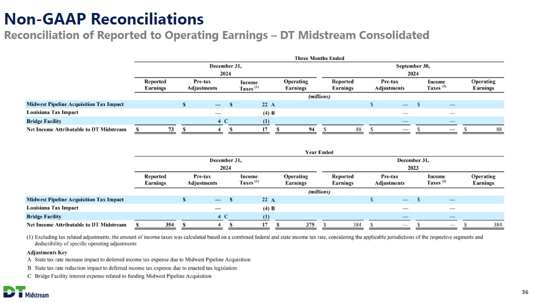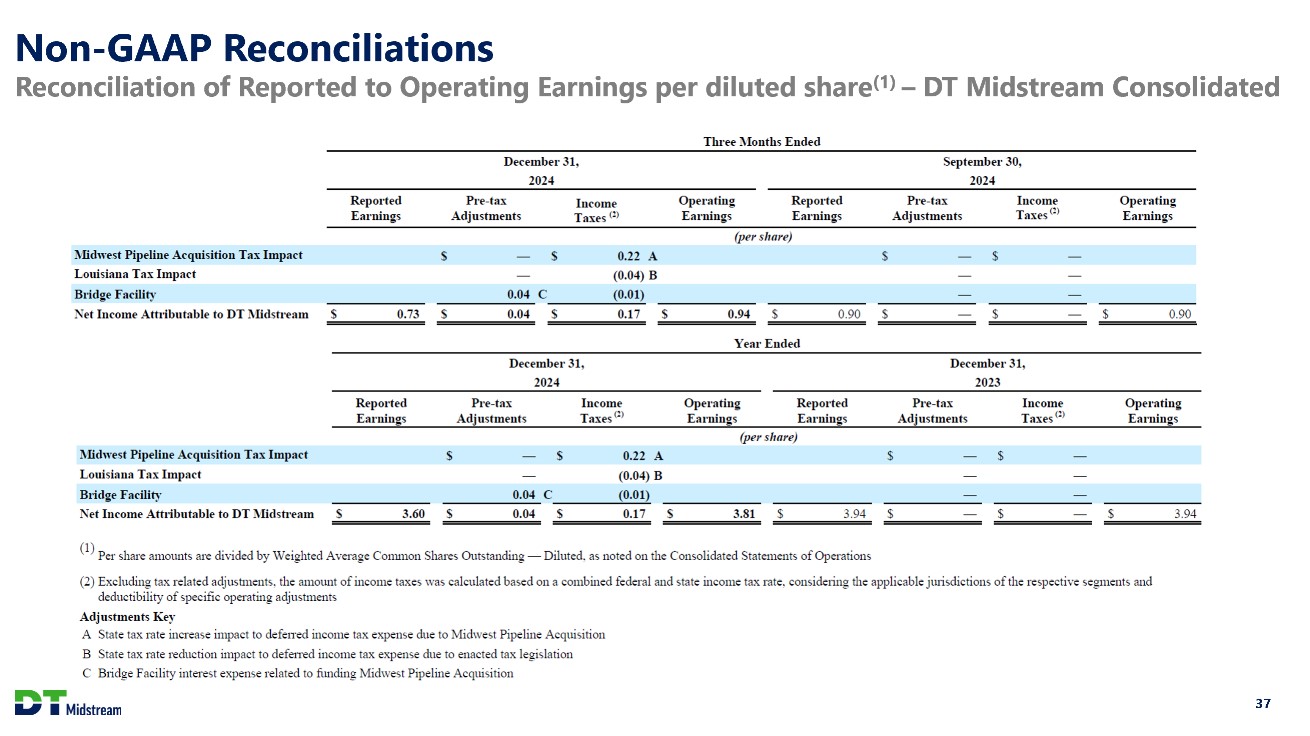 Non-GAAP Reconciliations Reconciliation of Reported to Operating Earnings - DT Midstream Consolidated Three Months Ended December 31, 2024 September 30, 2024 Reported Earnings Pre-tax Adjustments Income Taxes(1) Operating Earnings Reported Earnings Pre-tax Adjustments Income Taxes(1) Operating Earnings (millions) Midwest Pipeline Acquisition Tax Impact Louisiana Tax Import Bridge Facility Net Income Attributable to DT Midstream $73 $ - - 4 $4 C $22 (4) (1) $17 A B $94 $88 $- - - $ - - - - - $88 Year Ended December 31, 2024 December 31, 2023 Reported Earnings Pre-tax Adjustments Income Taxes(1) Operating Earnings Reported Earnings Pre-tax Adjustments Income Taxes(1) Operating Earnings (millions) Midwest Pipeline Acquisition Tax Impact Louisiana Tax Import Bridge Facility Net Income Attributable to DT Midstream $354 $ - - C 4 $4 $22 (4) (1) $17 A B $375 $384 $ - - - $ - $ - - - $ - $384 (1) Excluding tax related adjustments, the amount of income taxes was calculated based on a combined federal and state income tax rate, considering the applicable jurisdictions of the respective segments and deductibility of specific operating adjustments Adjustments Key A State tax rate increase impact to deferred income tax expense due to Midwest Pipeline Acquisition B State tax rate reductions impact to deferred income tax expense due to enacted tax legislation C Bridge Facility interest expense related to funding Midwest Pipeline Acquisition DTMidstream 36