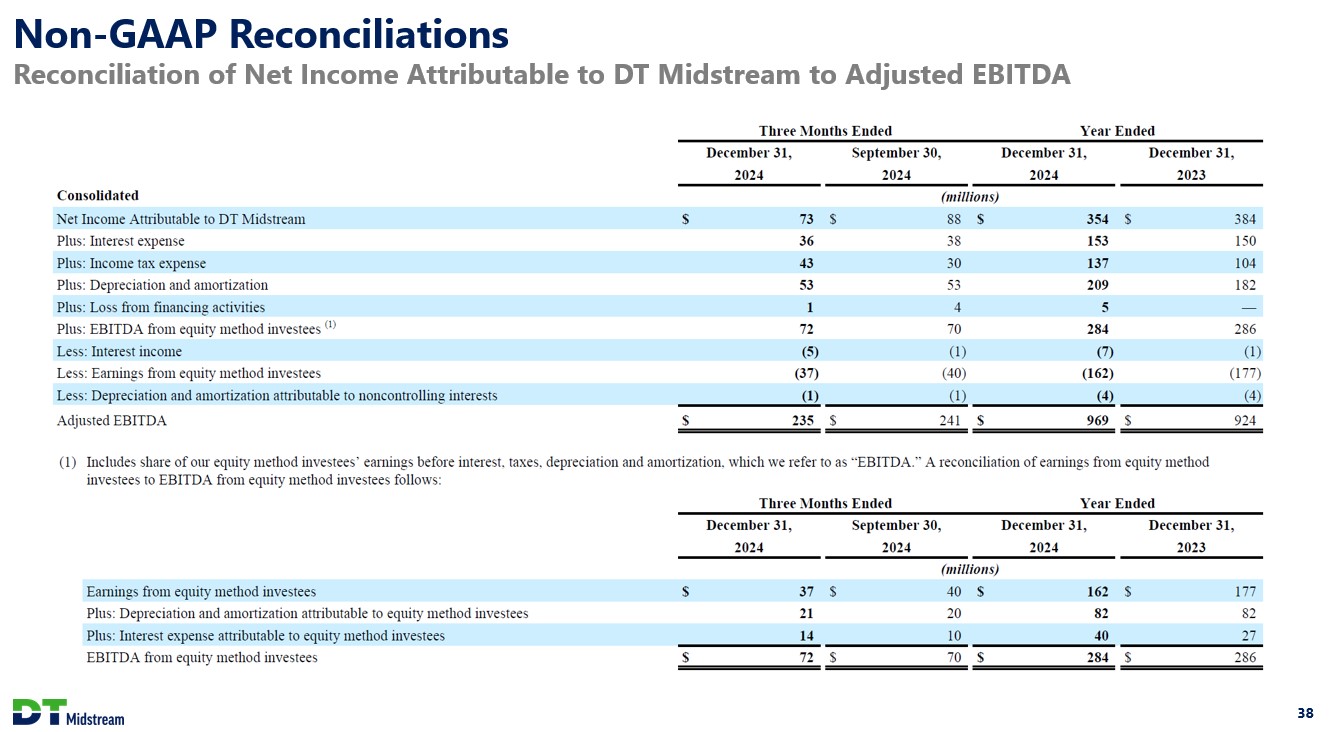 Non-GAAP Reconciliations Reconciliation of Net Income Attributable to DT Midstream to Adjusted EBITDA Three Months Ended Year Ended December 31, 2024 September 30, 2024 December 31, 2024 December 31, 2023 (millions) Consolidated Net Income Attributable to DT Midstream Plus: Interest expense Plus: Income tax expense Plus: Depreciation and amortization Plus: Loss from financing activities Plus: EBITDA from equity method investees(1) Less: Interest income Less: Earnings from equity method investees Less: Depreciation and amortization attributable to noncontrolling interests Adjusted EBITDA $73 36 43 53 1 72 (5) (37) (1) $235 $88 38 30 53 4 70 (1) (40) (1) $241 $354 153 137 209 5 284 (7) (162) (4) $969 $384 150 104 182 - 286 (1) (177) (4) $924 (1) Includes share of our equity method investees' earnings before interest, taxes, depreciation and amortization, which we refer to "EBITDA." A reconciliation of earnings from equity method investees to EBITDA from equity method investees follows: Three Months Ended Year Ended December 31, 2024 September 30, 2024 December 31, 2024 December 31, 2023 (millions) Earnings from equity method investees Plus: Depreciation and amortization attributable to equity method investees Plus: Interest expense attributable to equity method investees EBITDA from equity method investees $37 21 14 $72 $40 20 10 $70 $162 82 40 $284 $177 82 27 $286 DTMidstream 38