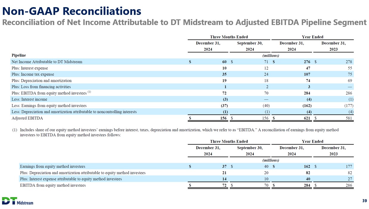 Non-GAAP Reconciliations Reconciliation of Net Income Attributable to DT Midstream to Adjusted EBITDA Pipeline Segment Three Months Ended Year Ended December 31, 2024 September 30, 2024 December 31, 2024 December 31, 2023 (millions) Pipeline Net Income Attributable to DT Midstream Plus: Interest expense Plus: Income tax expense Plus: Depreciation and amortization Plus: Loss from financing activities Plus: EBITDA from equity method investees(1) Less: Interest income Less: Earnings from equity method investees Less: Depreciation and amortization attributable to noncontrolling interests Adjusted EBITDA $60 10 35 19 1 72 (3) (37) (1) $156 $71 12 24 18 2 70 - (40) (1) $156 $276 47 107 74 3 284 (4) (162) (4) $621 $278 55 75 69 - 286 (1) (177) (4) $581 (1) Includes share of our equity method investees' earnings before interest, taxes, depreciation and amortization, which we refer to "EBITDA." A reconciliation of earnings from equity method investees to EBITDA from equity method investees follows: Three Months Ended Year Ended December 31, 2024 September 30, 2024 December 31, 2024 December 31, 2023 (millions) Earnings from equity method investees Plus: Depreciation and amortization attributable to equity method investees Plus: Interest expense attributable to equity method investees EBITDA from equity method investees $37 21 14 $72 $40 20 10 $70 $162 82 40 $284 $177 82 27 $286 DTMidstream 39