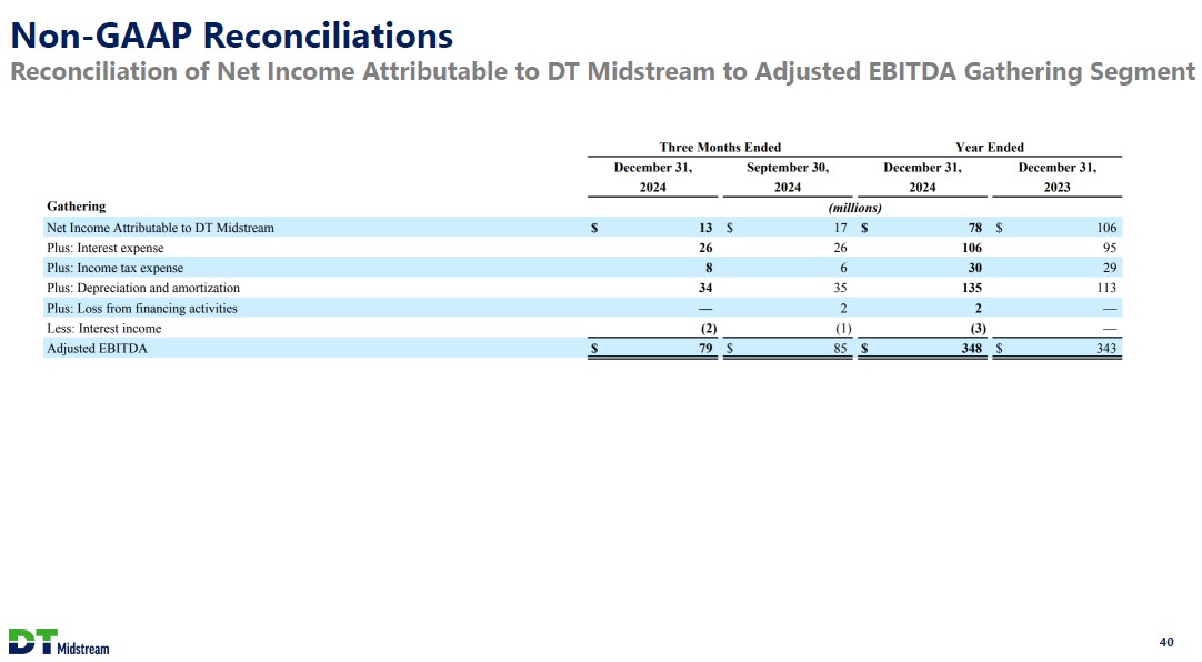 Non-GAAP Reconciliations Reconciliation of Net Income Attributable to DT Midstream to Adjusted EBITDA Gathering Segment Three Months Ended Year Ended December 31, 2024 September 30, 2024 December 31, 2024 December 31, 2023 (millions) Gathering Net Income Attributable to DT Midstream Plus: Interest expense Plus: Income tax expense Plus: Depreciation and amortization Plus: Loss from financing activities Plus: EBITDA from equity method investees(1) Less: Interest income Adjusted EBITDA $13 26 8 34 - (2) $79 $17 26 6 35 2 (1) $85 $78 106 30 135 2 (3) $348 $106 95 29 113 - - $343 DTMidstream 40