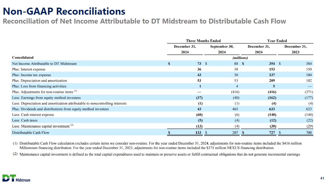 Non-GAAP Reconciliations Reconciliation of Net Income Attributable to DT Midstream to Distributable Cash Flow Three Months Ended Year Ended December 31, 2024 September 30, 2024 December 31, 2024 December 31, 2023 (millions) Consolidated Net Income Attributable to DT Midstream Plus: Interest expense Plus: Income tax expense Plus: Depreciation and amortization Plus: Loss from financing activities Plus: Adjustments for non-routine items(1) Less: Earnings from equity method investees Less: Depreciation and amortization attributable to noncontrolling interests Plus: Dividends and distributions from equity method investees Less: Cash taxes Less: Maintenance capital investment(2) Distributable Cash Flow $73 36 43 53 1 - (37) (1) 43 (60) (5) (13) $133 $88 38 30 53 4 (416) (40) (1) 465 (6) (4) (4) $207 $354 153 137 209 5 (416) (162) (4) 633 (140) (12) (30) $727 $384 150 104 182 - (371) (177) (4) 623 (140) (22) (29) $700 (1) Distributable Cash Flow calculations excluded certain items we consider non-routine. For the year ended December 31, 2024, adjustments for non-routine items included the $416 million Millennium financing distribution. For the year ended December 31, 2023, adjustments for non-routine items included the $371 million NEXUS financing distribution. (2) Maintenance capital investment is defined as the total capital expenditures used to maintain or preserve assets or fulfill contractual obligations that do not generate incremental earnings. DTMidstream 41