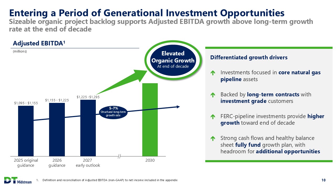 75%  Pipeline  20%  Gathering  9  Capital Project Backlog Opportunities Expand to ~$3.4 billion  50% increase, highly concentrated in pipeline projects  Pipeline  Project  Contribution  Status  Midwestern Gas Transmission power plant lateral  Q1 2026  Under construction  Millennium R2R  Q1 2027  Precedent agreement  Phase 1 & 2 Interstate Pipelines Modernization  2H 2027 / 1H 2028  Under construction  Viking Gas Transmission expansion  Q4 2027  Under construction  Guardian Pipeline “G3” expansion  Q4 2028  Under construction  Vector pipeline expansion  2028  Precedent agreement  Stonewall/Appalachia Gathering power plant lateral  2030  Precedent agreement  NEXUS interconnections / laterals  2027-30  Pre-FID3  Interstate pipelines expansions  2028-30  Pre-FID  Haynesville System (LEAP) expansions  2028-30  Pre-FID  Storage development/expansion  2028-30  Pre-FID  Interstate pipelines power plant laterals  2027-30  Pre-FID  Modernization of interstate assets  2029-30  Pre-FID  Gathering  Project  Contribution  Status  Blue Union Gathering well pad expansions & buildout  2027-28  Pre-FID  Ohio Utica Gathering buildout  2027-28  Pre-FID  Tioga Gathering buildout  2028-29  Pre-FID  Appalachia Gathering System expansions  2027-30  Pre-FID  Backlog Project Composition  Probability-adjusted  Pre-FID Louisiana CCS Project  Final investment decision  2025-2029  2026-2030  ~50%  DTM Organic Project Backlog1, $B  Projects at 5-8x build multiples
