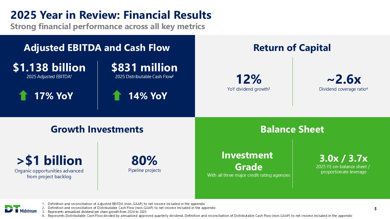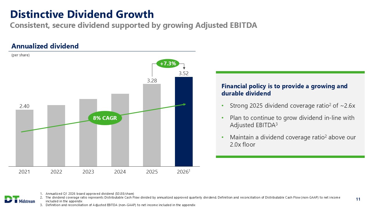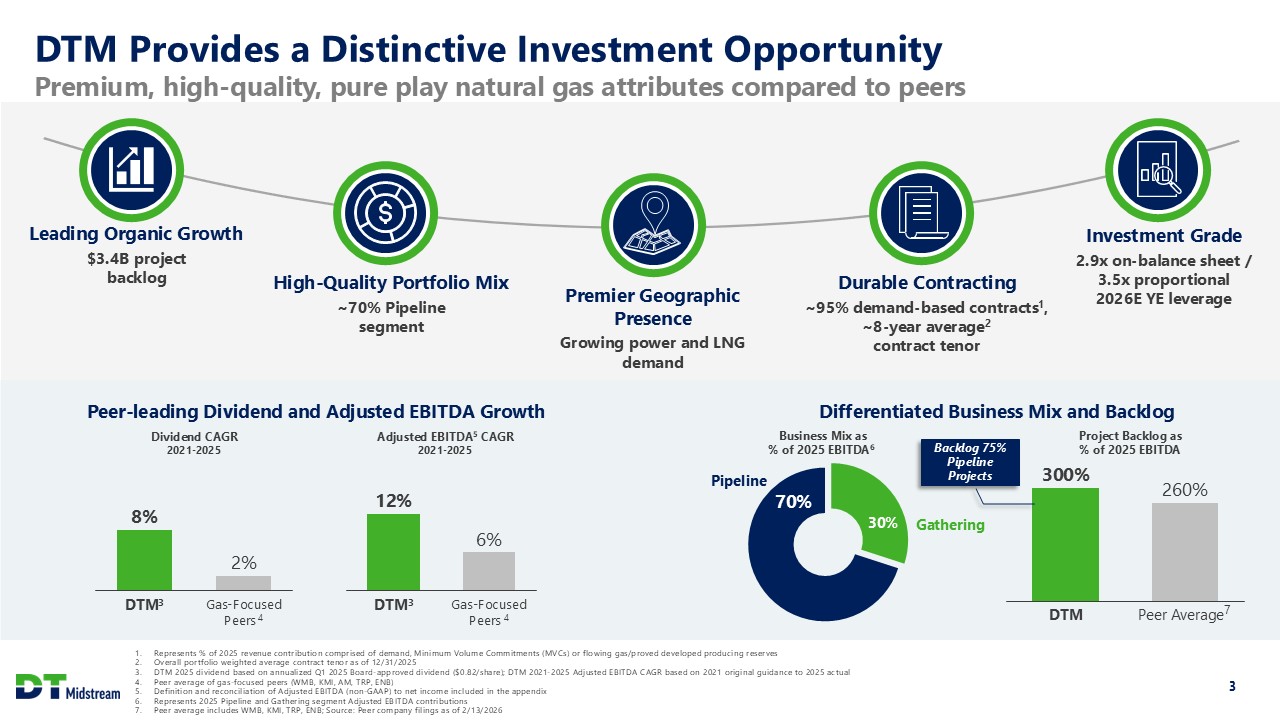 Leading Organic Growth  $3.4B project   backlog  DTM Provides a Distinctive Investment Opportunity  Premium, high-quality, pure play natural gas attributes compared to peers  High-Quality Portfolio Mix  ~70% Pipeline   segment  Premier Geographic Presence  Growing power and LNG demand  Durable Contracting  ~95% demand-based contracts1,  ~8-year average2   contract tenor  Represents % of 2025 revenue contribution comprised of demand, Minimum Volume Commitments (MVCs) or flowing gas/proved developed producing reserves  Overall portfolio weighted average contract tenor as of 12/31/2025  DTM 2025 dividend based on annualized Q1 2025 Board-approved dividend ($0.82/share); DTM 2021-2025 Adjusted EBITDA CAGR based on 2021 original guidance to 2025 actual  Peer average of gas-focused peers (WMB, KMI, AM, TRP, ENB)  Definition and reconciliation of Adjusted EBITDA (non-GAAP) to net income included in the appendix  Represents 2025 Pipeline and Gathering segment Adjusted EBITDA contributions  Peer average includes WMB, KMI, TRP, ENB; Source: Peer company filings as of 2/13/2026  Investment Grade   2.9x on-balance sheet / 3.5x proportional  2026E YE leverage  DTM3  Gas-Focused Peers 4  8%  2%  Adjusted EBITDA5 CAGR  2021-2025  Dividend CAGR  2021-2025  Differentiated Business Mix and Backlog  Business Mix as  % of 2025 EBITDA6   Pipeline  Gathering  70%  3  30%  Peer-leading Dividend and Adjusted EBITDA Growth  DTM  Peer Average7  300%  260%  Project Backlog as   % of 2025 EBITDA  DTM3  Gas-Focused Peers 4  12%  6%  Backlog 75% Pipeline Projects