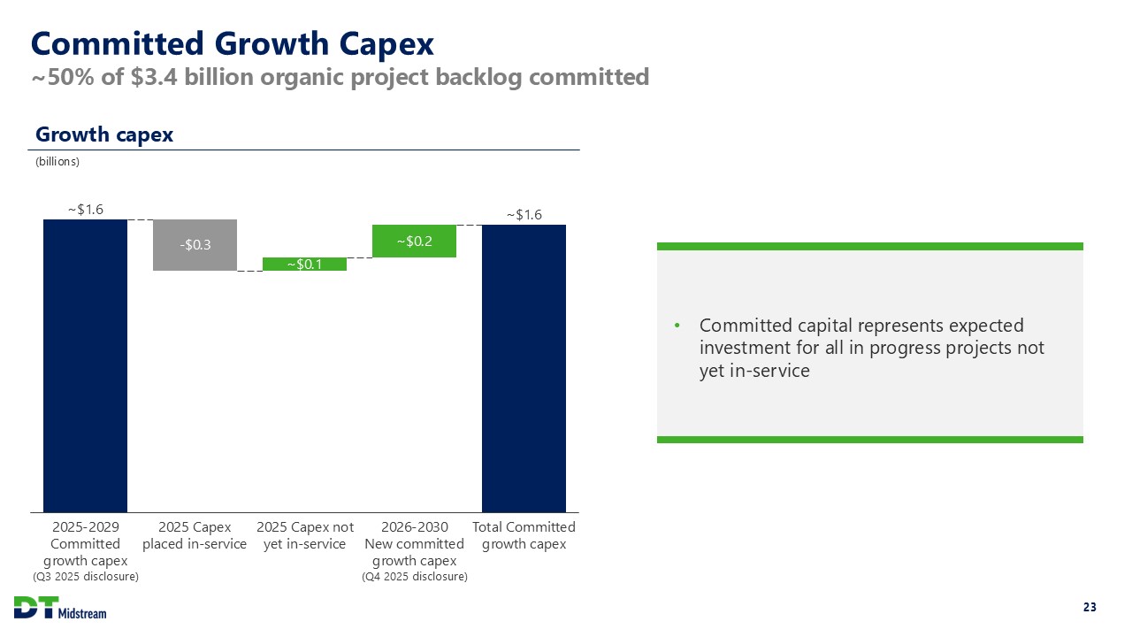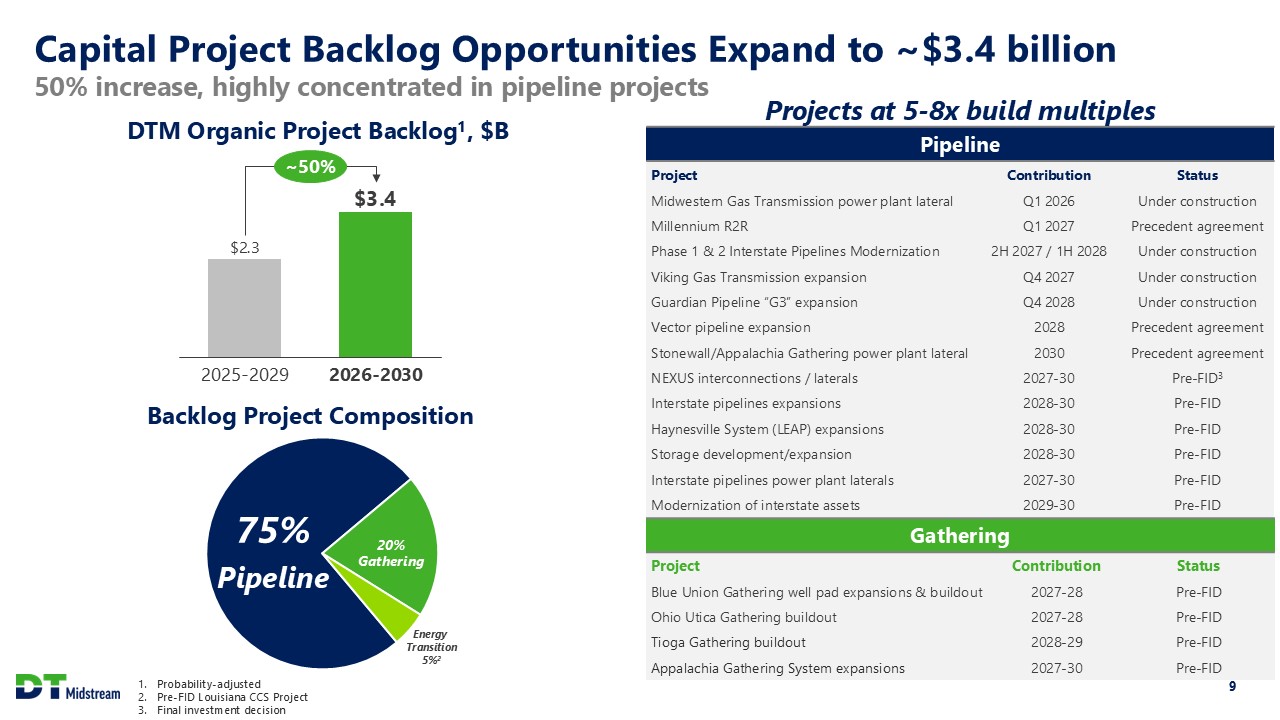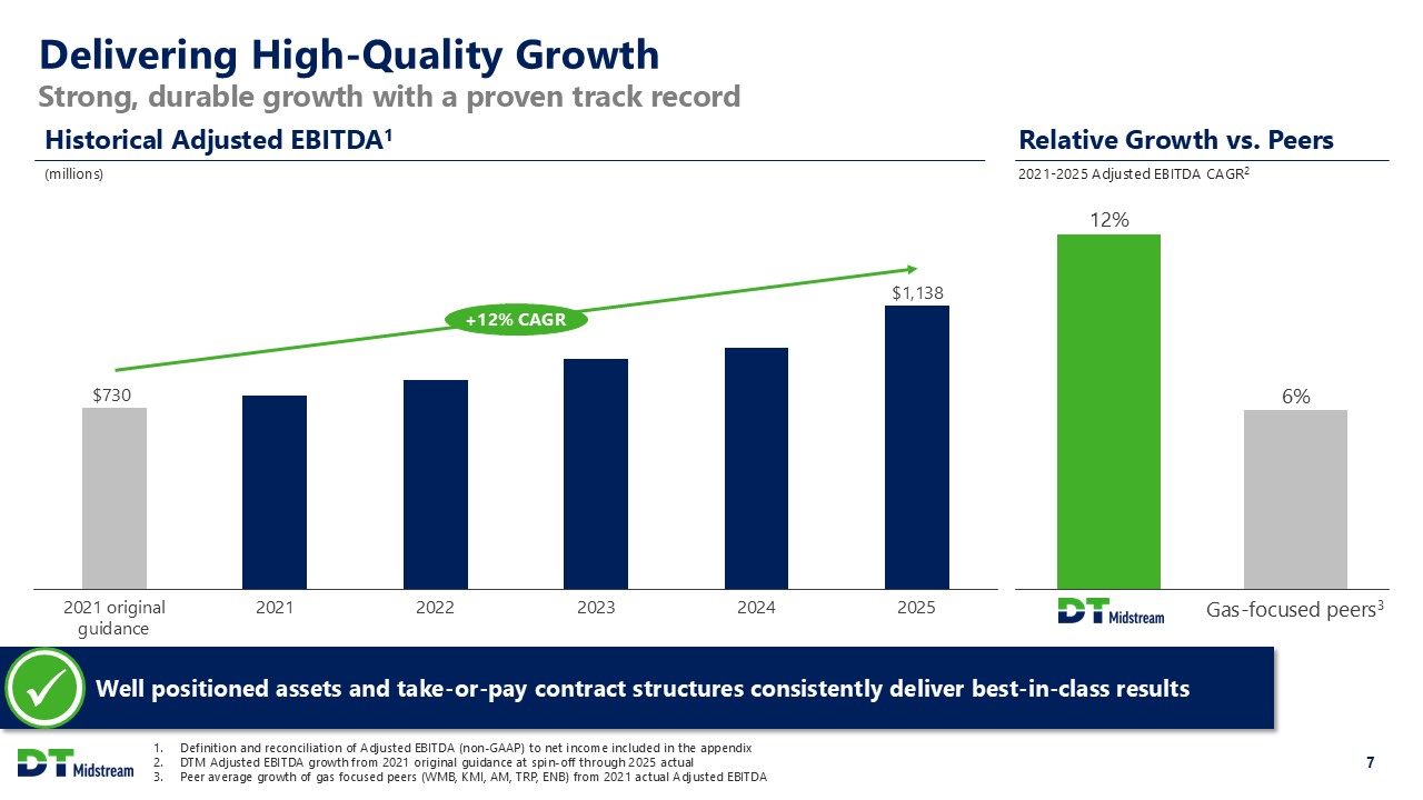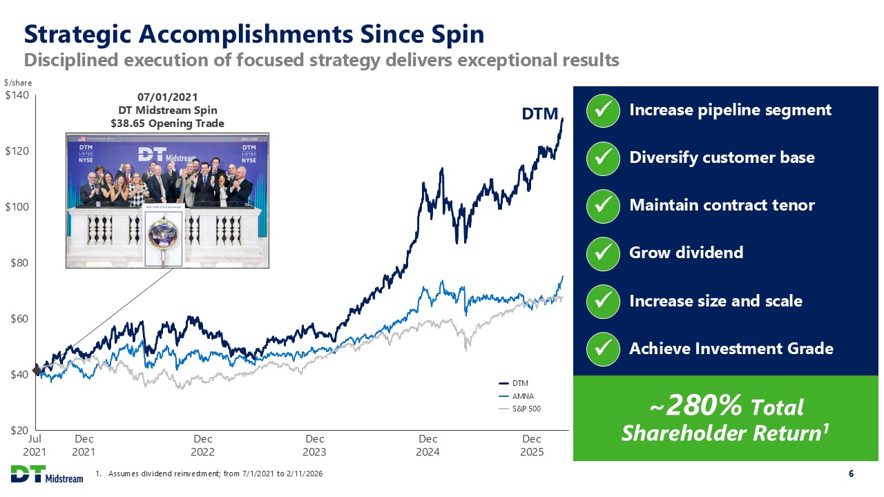 Leading Organic Growth  $3.4B project   backlog  DTM Provides a Distinctive Investment Opportunity  Premium, high-quality, pure play natural gas attributes compared to peers  High-Quality Portfolio Mix  ~70% Pipeline   segment  Premier Geographic Presence  Growing power and LNG demand  Durable Contracting  ~95% demand-based contracts1,  ~8-year average2   contract tenor  Represents % of 2025 revenue contribution comprised of demand, Minimum Volume Commitments (MVCs) or flowing gas/proved developed producing reserves  Overall portfolio weighted average contract tenor as of 12/31/2025  DTM 2025 dividend based on annualized Q1 2025 Board-approved dividend ($0.82/share); DTM 2021-2025 Adjusted EBITDA CAGR based on 2021 original guidance to 2025 actual  Peer average of gas-focused peers (WMB, KMI, AM, TRP, ENB)  Definition and reconciliation of Adjusted EBITDA (non-GAAP) to net income included in the appendix  Represents 2025 Pipeline and Gathering segment Adjusted EBITDA contributions  Peer average includes WMB, KMI, TRP, ENB; Source: Peer company filings as of 2/13/2026  Investment Grade   2.9x on-balance sheet / 3.5x proportional  2026E YE leverage  DTM3  Gas-Focused Peers 4  8%  2%  Adjusted EBITDA5 CAGR  2021-2025  Dividend CAGR  2021-2025  Differentiated Business Mix and Backlog  Business Mix as  % of 2025 EBITDA6   Pipeline  Gathering  70%  3  30%  Peer-leading Dividend and Adjusted EBITDA Growth  DTM  Peer Average7  300%  260%  Project Backlog as   % of 2025 EBITDA  DTM3  Gas-Focused Peers 4  12%  6%  Backlog 75% Pipeline Projects