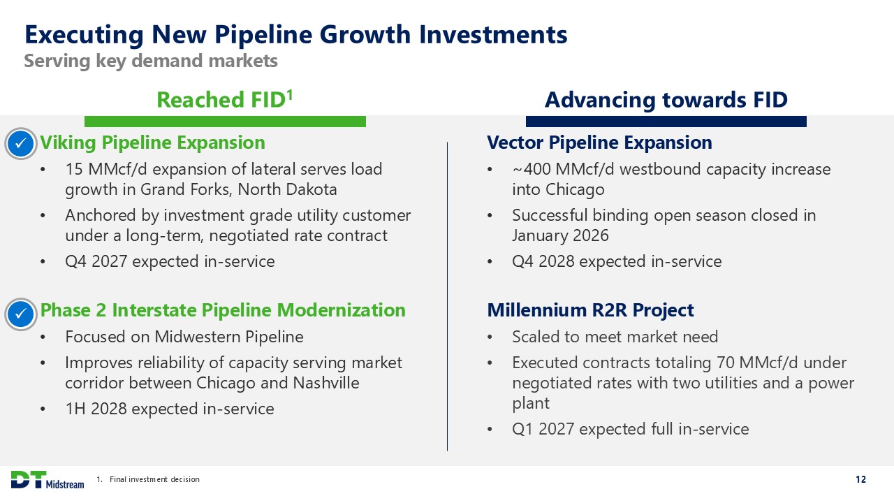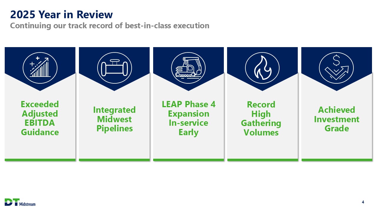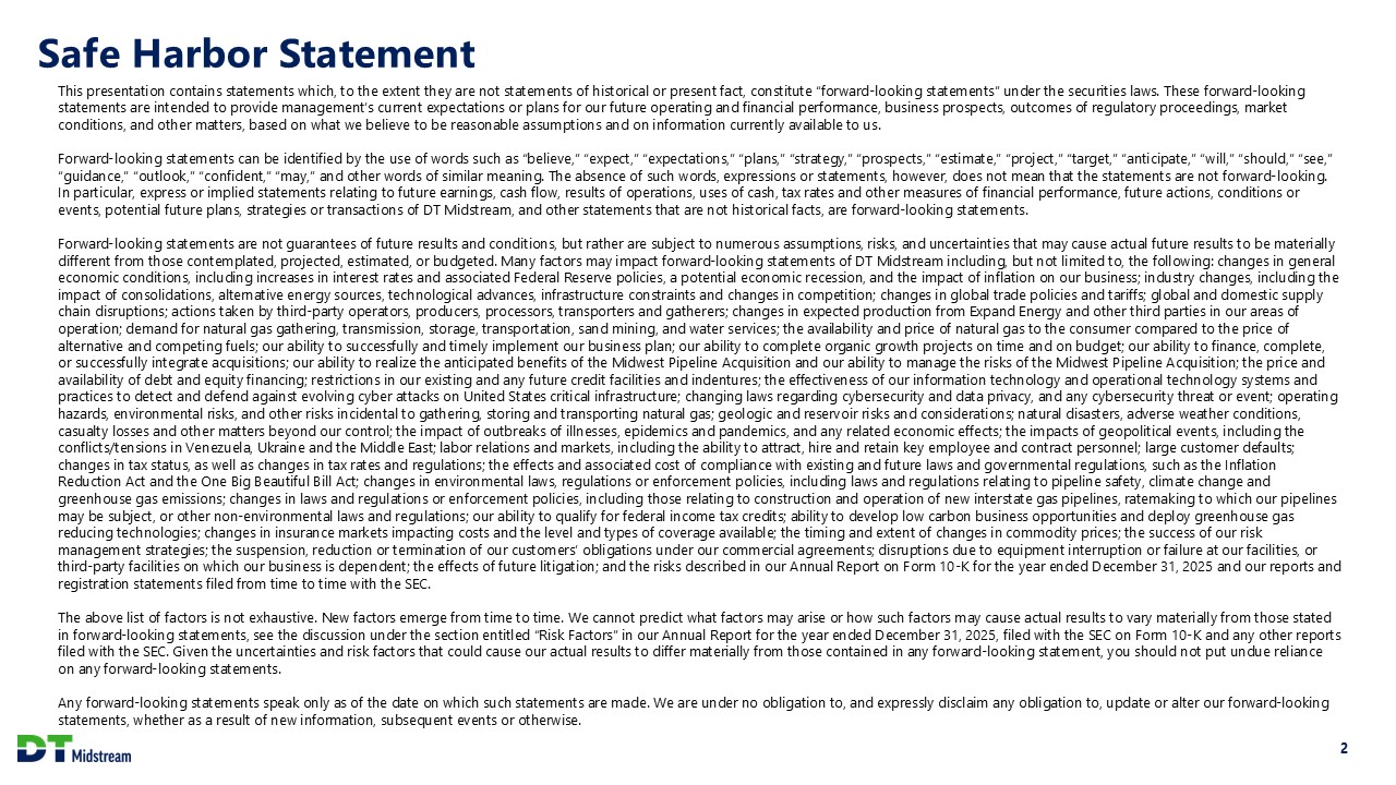 2  Safe Harbor Statement  New slide  This presentation contains statements which, to the extent they are not statements of historical or present fact, constitute “forward-looking statements” under the securities laws. These forward-looking statements are intended to provide management’s current expectations or plans for our future operating and financial performance, business prospects, outcomes of regulatory proceedings, market conditions, and other matters, based on what we believe to be reasonable assumptions and on information currently available to us.   Forward-looking statements can be identified by the use of words such as “believe,” “expect,” “expectations,” “plans,” “strategy,” “prospects,” “estimate,” “project,” “target,” “anticipate,” “will,” “should,” “see,” “guidance,” “outlook,” “confident,” “may,” and other words of similar meaning. The absence of such words, expressions or statements, however, does not mean that the statements are not forward-looking. In particular, express or implied statements relating to future earnings, cash flow, results of operations, uses of cash, tax rates and other measures of financial performance, future actions, conditions or events, potential future plans, strategies or transactions of DT Midstream, and other statements that are not historical facts, are forward-looking statements.   Forward-looking statements are not guarantees of future results and conditions, but rather are subject to numerous assumptions, risks, and uncertainties that may cause actual future results to be materially different from those contemplated, projected, estimated, or budgeted. Many factors may impact forward-looking statements of DT Midstream including, but not limited to, the following: changes in general economic conditions, including increases in interest rates and associated Federal Reserve policies, a potential economic recession, and the impact of inflation on our business; industry changes, including the impact of consolidations, alternative energy sources, technological advances, infrastructure constraints and changes in competition; changes in global trade policies and tariffs; global and domestic supply chain disruptions; actions taken by third-party operators, producers, processors, transporters and gatherers; changes in expected production from Expand Energy and other third parties in our areas of operation; demand for natural gas gathering, transmission, storage, transportation, sand mining, and water services; the availability and price of natural gas to the consumer compared to the price of alternative and competing fuels; our ability to successfully and timely implement our business plan; our ability to complete organic growth projects on time and on budget; our ability to finance, complete, or successfully integrate acquisitions; our ability to realize the anticipated benefits of the Midwest Pipeline Acquisition and our ability to manage the risks of the Midwest Pipeline Acquisition; the price and availability of debt and equity financing; restrictions in our existing and any future credit facilities and indentures; the effectiveness of our information technology and operational technology systems and practices to detect and defend against evolving cyber attacks on United States critical infrastructure; changing laws regarding cybersecurity and data privacy, and any cybersecurity threat or event; operating hazards, environmental risks, and other risks incidental to gathering, storing and transporting natural gas; geologic and reservoir risks and considerations; natural disasters, adverse weather conditions, casualty losses and other matters beyond our control; the impact of outbreaks of illnesses, epidemics and pandemics, and any related economic effects; the impacts of geopolitical events, including the conflicts/tensions in Venezuela, Ukraine and the Middle East; labor relations and markets, including the ability to attract, hire and retain key employee and contract personnel; large customer defaults; changes in tax status, as well as changes in tax rates and regulations; the effects and associated cost of compliance with existing and future laws and governmental regulations, such as the Inflation Reduction Act and the One Big Beautiful Bill Act; changes in environmental laws, regulations or enforcement policies, including laws and regulations relating to pipeline safety, climate change and greenhouse gas emissions; changes in laws and regulations or enforcement policies, including those relating to construction and operation of new interstate gas pipelines, ratemaking to which our pipelines may be subject, or other non-environmental laws and regulations; our ability to qualify for federal income tax credits; ability to develop low carbon business opportunities and deploy greenhouse gas reducing technologies; changes in insurance markets impacting costs and the level and types of coverage available; the timing and extent of changes in commodity prices; the success of our risk management strategies; the suspension, reduction or termination of our customers’ obligations under our commercial agreements; disruptions due to equipment interruption or failure at our facilities, or third-party facilities on which our business is dependent; the effects of future litigation; and the risks described in our Annual Report on Form 10-K for the year ended December 31, 2025 and our reports and registration statements filed from time to time with the SEC.  The above list of factors is not exhaustive. New factors emerge from time to time. We cannot predict what factors may arise or how such factors may cause actual results to vary materially from those stated in forward-looking statements, see the discussion under the section entitled “Risk Factors” in our Annual Report for the year ended December 31, 2025, filed with the SEC on Form 10-K and any other reports filed with 