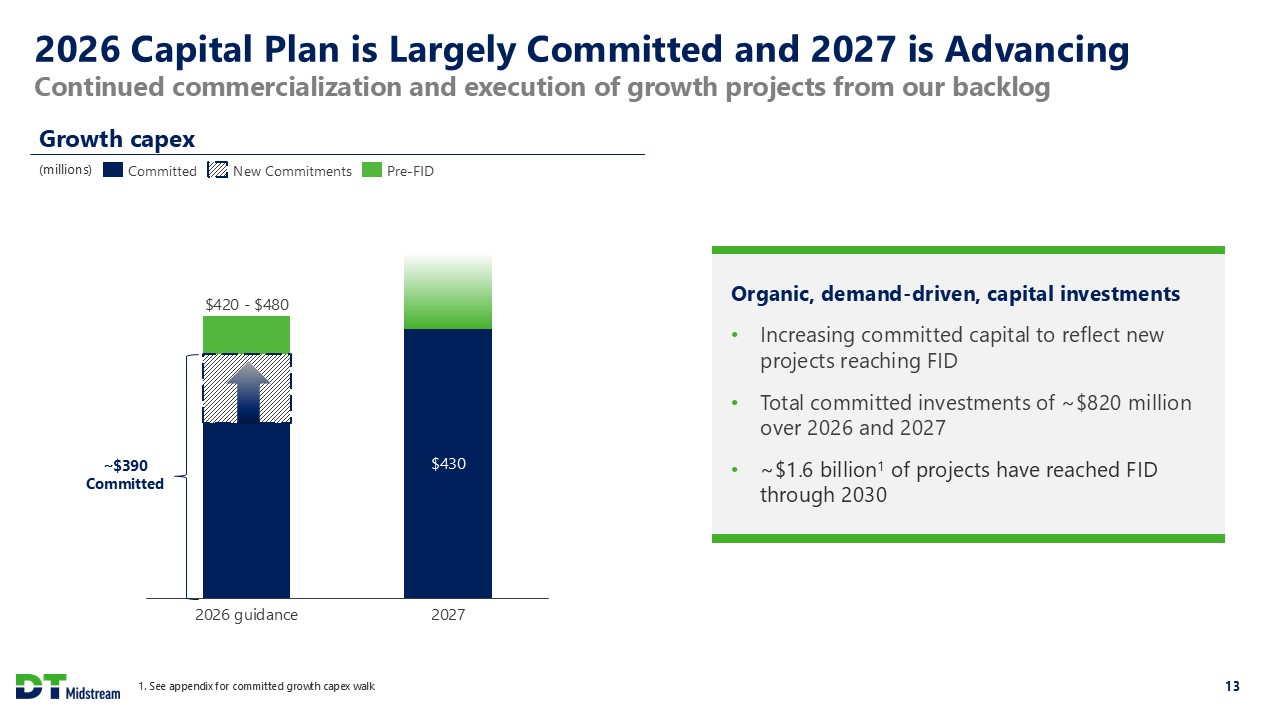 2026 guidance  2027  $420 - $480  1. See appendix for committed growth capex walk   13  2026 Capital Plan is Largely Committed and 2027 is Advancing  Continued commercialization and execution of growth projects from our backlog  Growth capex  (millions)  Organic, demand-driven, capital investments  Increasing committed capital to reflect new projects reaching FID  Total committed investments of ~$820 million over 2026 and 2027  ~$1.6 billion1 of projects have reached FID through 2030  Committed  New Commitments  Pre-FID  ~$390  Committed