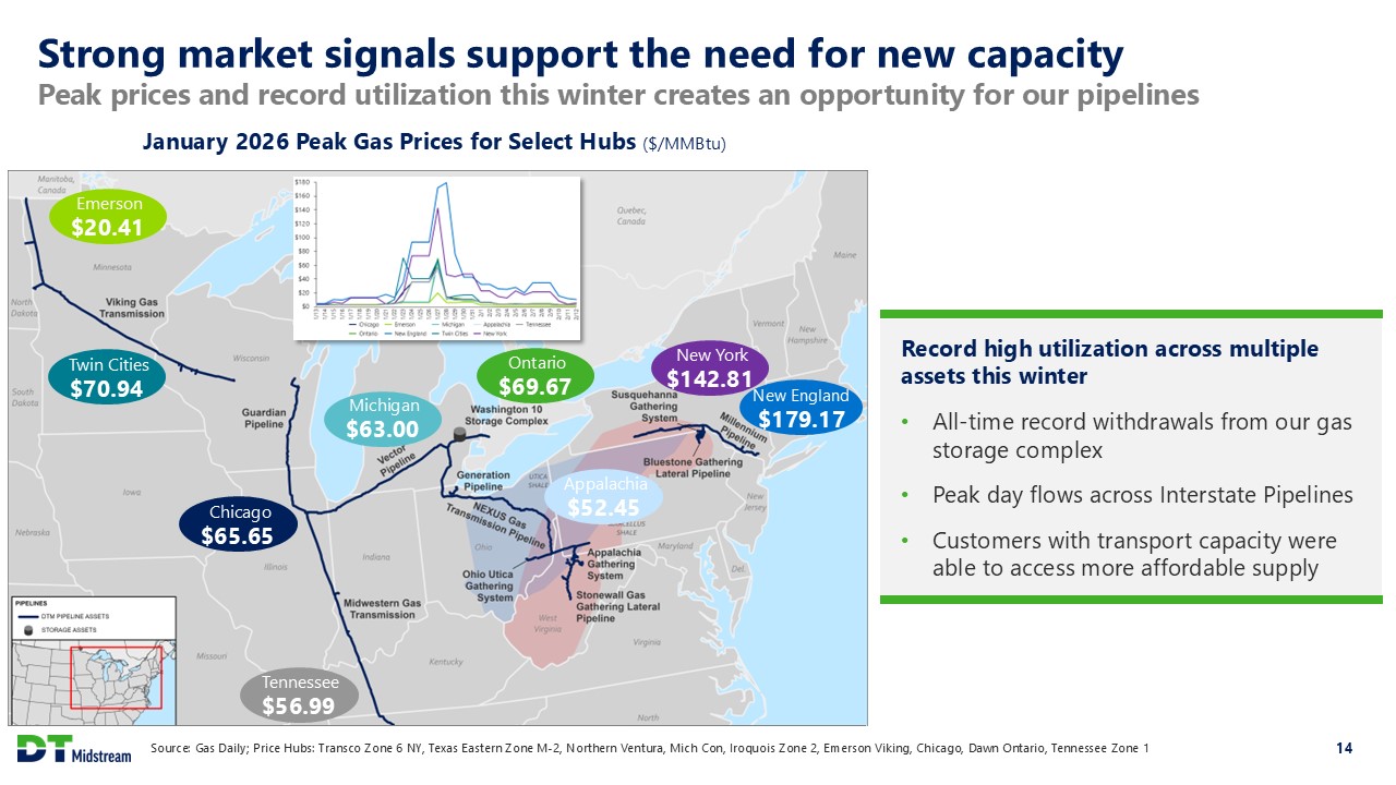 Source: Gas Daily; Price Hubs: Transco Zone 6 NY, Texas Eastern Zone M-2, Northern Ventura, Mich Con, Iroquois Zone 2, Emerson Viking, Chicago, Dawn Ontario, Tennessee Zone 1  14  Strong market signals support the need for new capacity  Peak prices and record utilization this winter creates an opportunity for our pipelines  Record high utilization across multiple assets this winter  All-time record withdrawals from our gas storage complex  Peak day flows across Interstate Pipelines  Customers with transport capacity were able to access more affordable supply  January 2026 Peak Gas Prices for Select Hubs ($/MMBtu)  1/13  1/14  1/15  1/16  1/17  1/18  1/19  1/20  1/21  1/22  1/23  1/24  1/25  1/26  1/27  1/28  1/29  1/30  1/31  2/1  2/2  2/3  2/4  2/5  2/6  2/7  2/8  2/9  2/10  2/11  2/12  Chicago  Ontario  Emerson  New England  Michigan  Twin Cities  Appalachia  New York  Tennessee   Twin Cities  $70.94   Chicago  $65.65   Michigan  $63.00   Ontario  $69.67   Emerson  $20.41  New England  $179.17   New York  $142.81   Tennessee  $56.99   Appalachia  $52.45