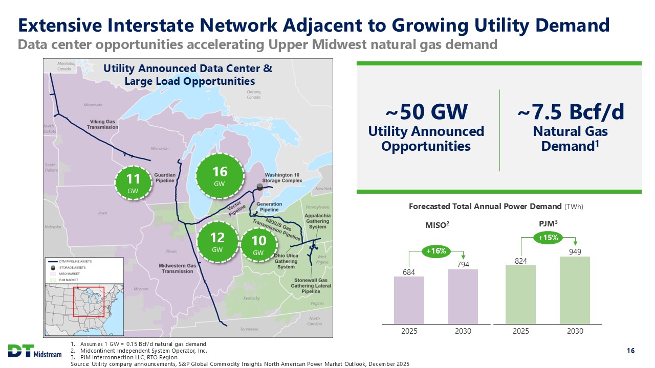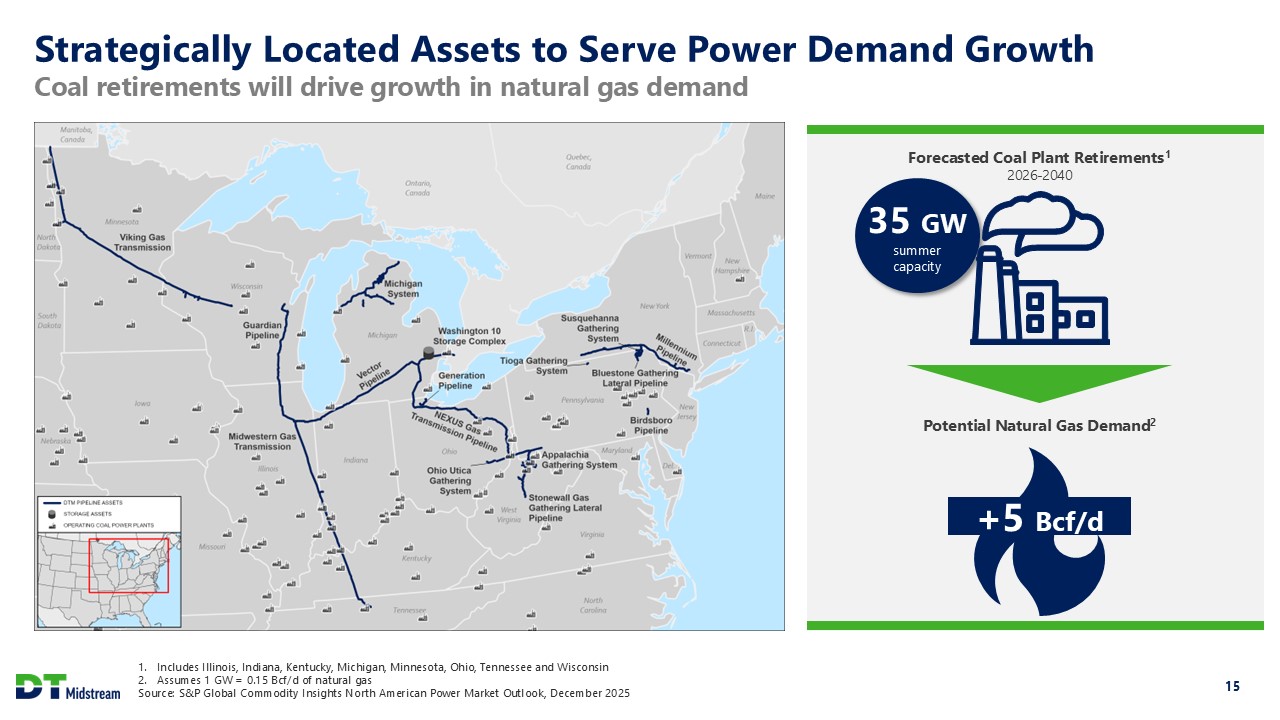 Includes Illinois, Indiana, Kentucky, Michigan, Minnesota, Ohio, Tennessee and Wisconsin  Assumes 1 GW = 0.15 Bcf/d of natural gas  Source: S&P Global Commodity Insights North American Power Market Outlook, December 2025  15  Strategically Located Assets to Serve Power Demand Growth  Coal retirements will drive growth in natural gas demand  35 GW  summer   capacity  Forecasted Coal Plant Retirements1   2026-2040   +5 Bcf/d  Potential Natural Gas Demand2