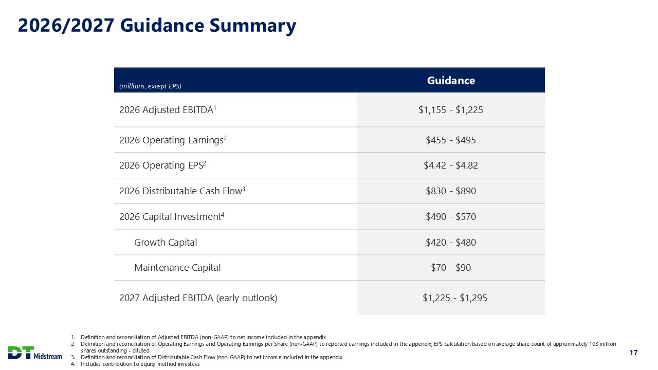 Definition and reconciliation of Adjusted EBITDA (non-GAAP) to net income included in the appendix  Definition and reconciliation of Operating Earnings and Operating Earnings per Share (non-GAAP) to reported earnings included in the appendix; EPS calculation based on average share count of approximately 103 million shares outstanding - diluted  Definition and reconciliation of Distributable Cash Flow (non-GAAP) to net income included in the appendix  Includes contribution to equity method investees  17  2026/2027 Guidance Summary  (millions, except EPS)  Guidance  2026 Adjusted EBITDA1  $1,155 - $1,225  2026 Operating Earnings2  $455 - $495  2026 Operating EPS2  $4.42 - $4.82  2026 Distributable Cash Flow3  $830 - $890  2026 Capital Investment4  $490 - $570  Growth Capital  $420 - $480  Maintenance Capital  $70 - $90  2027 Adjusted EBITDA (early outlook)   $1,225 - $1,295