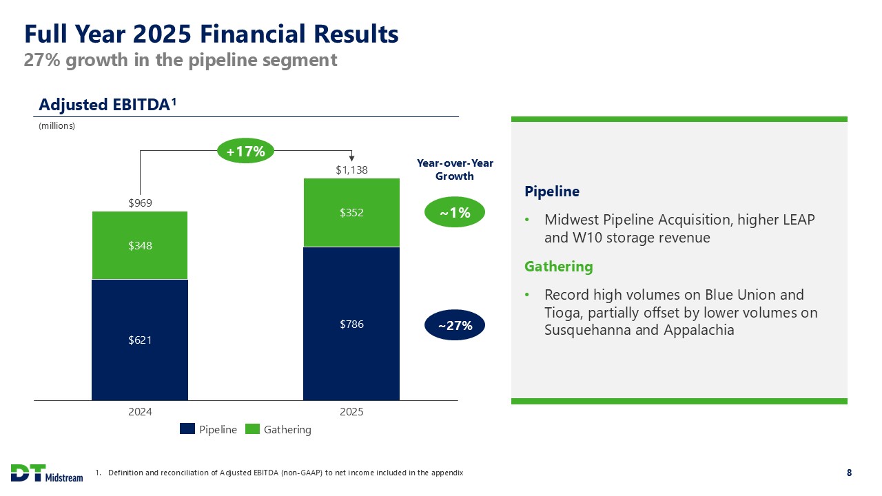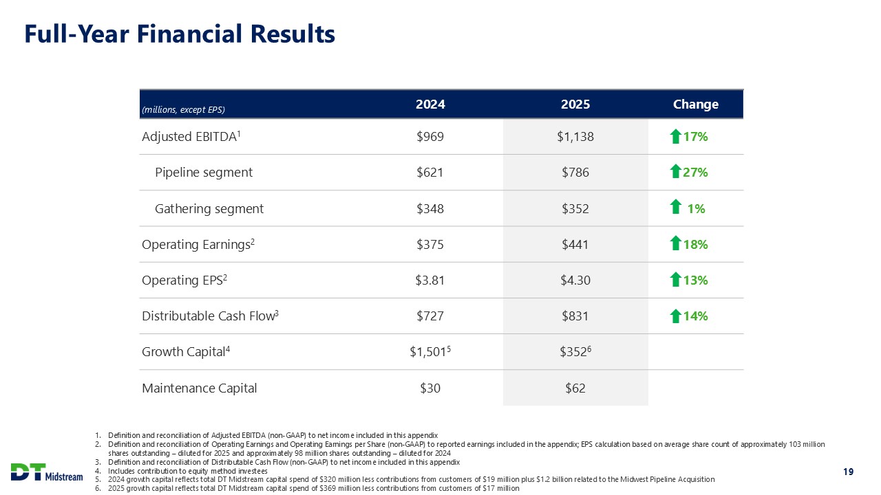 Definition and reconciliation of Adjusted EBITDA (non-GAAP) to net income included in this appendix  Definition and reconciliation of Operating Earnings and Operating Earnings per Share (non-GAAP) to reported earnings included in the appendix; EPS calculation based on average share count of approximately 103 million shares outstanding – diluted for 2025 and approximately 98 million shares outstanding – diluted for 2024  Definition and reconciliation of Distributable Cash Flow (non-GAAP) to net income included in this appendix  Includes contribution to equity method investees   2024 growth capital reflects total DT Midstream capital spend of $320 million less contributions from customers of $19 million plus $1.2 billion related to the Midwest Pipeline Acquisition  2025 growth capital reflects total DT Midstream capital spend of $369 million less contributions from customers of $17 million  19  Full-Year Financial Results  (millions, except EPS)  2024  2025  Change  Adjusted EBITDA1  $969  $1,138  17%  Pipeline segment  $621  $786  27%  Gathering segment  $348  $352  1%  Operating Earnings2  $375  $441  18%  Operating EPS2  $3.81  $4.30  13%  Distributable Cash Flow3  $727  $831  14%  Growth Capital4  $1,5015  $3526  Maintenance Capital  $30  $62