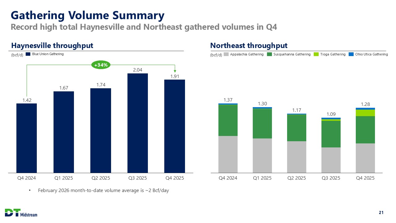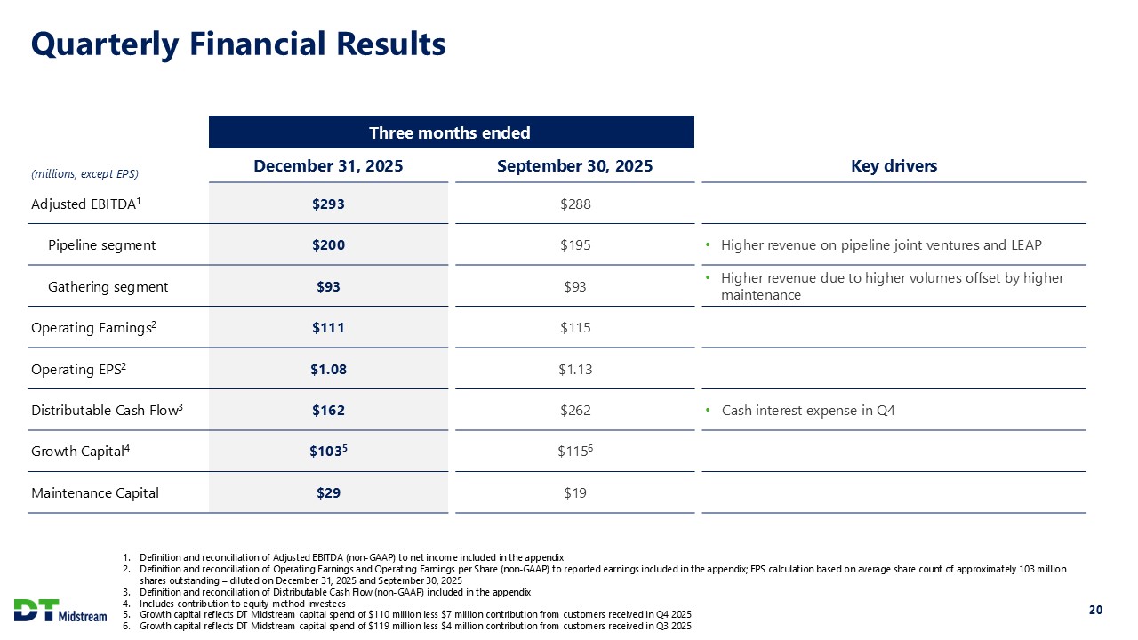 Definition and reconciliation of Adjusted EBITDA (non-GAAP) to net income included in the appendix  Definition and reconciliation of Operating Earnings and Operating Earnings per Share (non-GAAP) to reported earnings included in the appendix; EPS calculation based on average share count of approximately 103 million shares outstanding – diluted on December 31, 2025 and September 30, 2025  Definition and reconciliation of Distributable Cash Flow (non-GAAP) included in the appendix  Includes contribution to equity method investees   Growth capital reflects DT Midstream capital spend of $110 million less $7 million contribution from customers received in Q4 2025  Growth capital reflects DT Midstream capital spend of $119 million less $4 million contribution from customers received in Q3 2025  20  Quarterly Financial Results  Three months ended   (millions, except EPS)  December 31, 2025  September 30, 2025  Key drivers  Adjusted EBITDA1  $293  $288  Pipeline segment  $200  $195  Higher revenue on pipeline joint ventures and LEAP  Gathering segment  $93  $93  Higher revenue due to higher volumes offset by higher maintenance  Operating Earnings2  $111  $115  Operating EPS2  $1.08  $1.13  Distributable Cash Flow3  $162  $262  Cash interest expense in Q4  Growth Capital4  $1035  $1156  Maintenance Capital  $29  $19