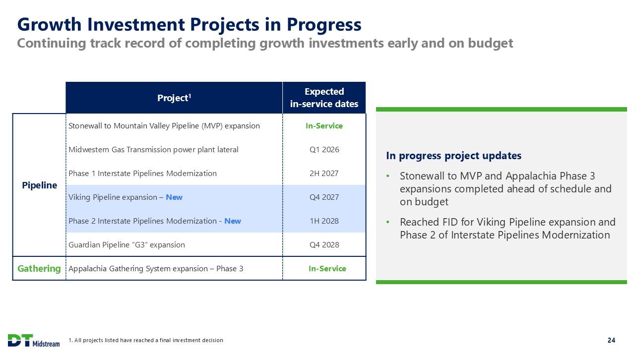 Growth Investment Projects in Progress  Continuing track record of completing growth investments early and on budget  In progress project updates  Stonewall to MVP and Appalachia Phase 3 expansions completed ahead of schedule and on budget  Reached FID for Viking Pipeline expansion and Phase 2 of Interstate Pipelines Modernization  Project1  Expected   in-service dates  Pipeline  Stonewall to Mountain Valley Pipeline (MVP) expansion  In-Service  Midwestern Gas Transmission power plant lateral  Q1 2026  Phase 1 Interstate Pipelines Modernization   2H 2027  Viking Pipeline expansion – New   Q4 2027  Phase 2 Interstate Pipelines Modernization - New   1H 2028  Guardian Pipeline “G3” expansion  Q4 2028  Gathering  Appalachia Gathering System expansion – Phase 3   In-Service  24  1. All projects listed have reached a final investment decision