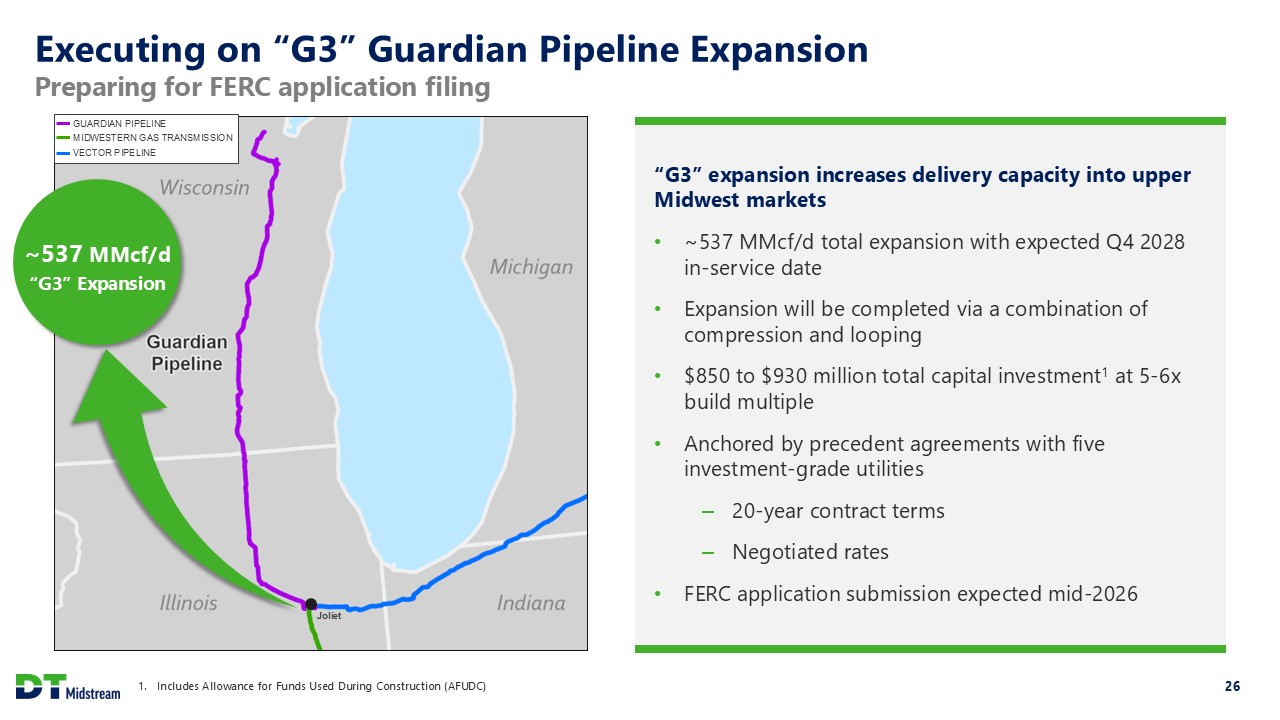 Represents dates by which pipelines must file rate cases  25  Phase 2 of Modernization on Interstate Pipelines Reaches FID  Continuing investment in modernization projects to enhance system efficiency and reliability   Second phase predominantly focused on Midwestern Pipeline  Modernization enhancements will improve system efficiency and reliability for customers  1H 2028 expected in-service date  Capital investment of $140 to $160 million will be recovered in next rate case  Additional modernization opportunities   Projects improve reliability and service quality for customers  Investments will be recovered in future rate cases  Rate Case Filing Timelines1  Guardian Pipeline  Midwestern Gas Transmission  Viking Gas Transmission  2H  2026  2H 2027  2H 2028