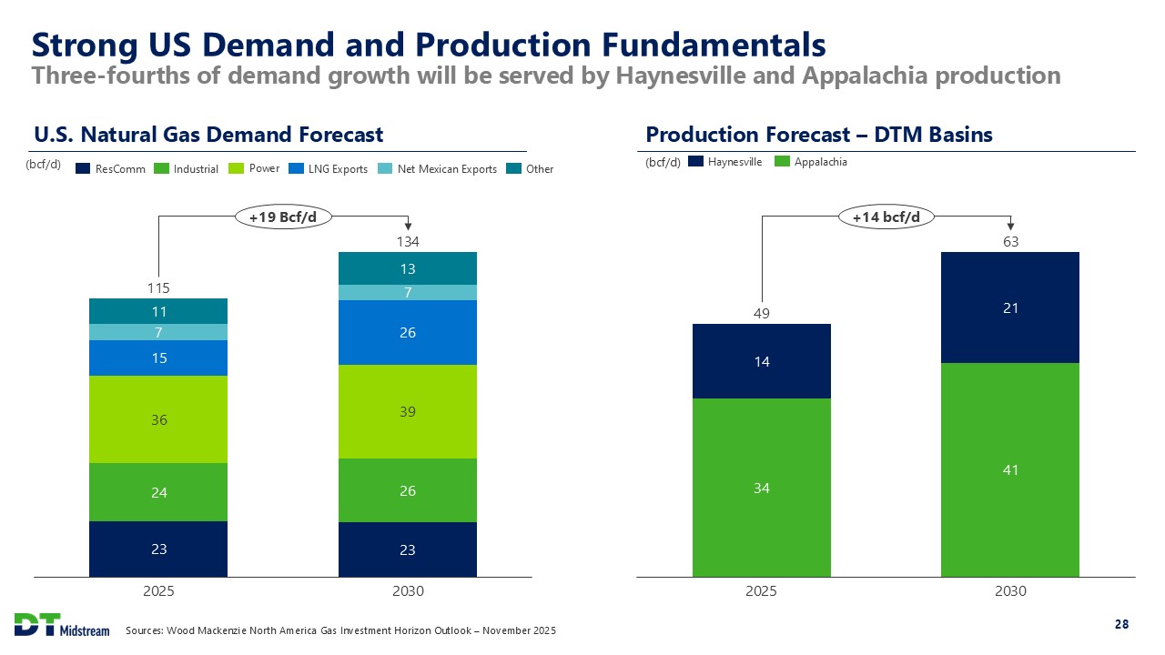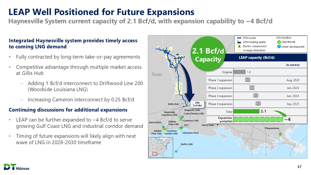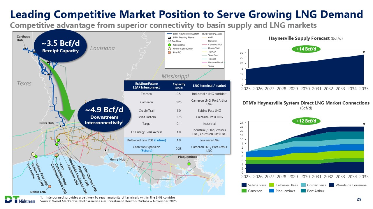 Interconnect provides a pathway to reach majority of terminals within the LNG corridor  Source: Wood Mackenzie North America Gas Investment Horizon Outlook – November 2025  29  Leading Competitive Market Position to Serve Growing LNG Demand   Competitive advantage from superior connectivity to basin supply and LNG markets  2025  2026  2027  2028  2029  2030  2031  2032  2033  2034  2035  +14 Bcf/d  Haynesville Supply Forecast (Bcf/d)  2025  2026  2027  2028  2029  2030  2031  2032  2033  2034  2035  +12 Bcf/d  DTM’s Haynesville System Direct LNG Market Connections (Bcf/d)  Sabine Pass  Cameron  Calcasieu Pass  Plaquemines  Golden Pass  Port Arthur  Woodside Louisiana  Existing/Future   LEAP Interconnect   Capacity (Bcf/d)  LNG terminal / market  Transco  0.5  Industrial / LNG corridor1  Cameron  0.25  Cameron LNG, Port Arthur LNG  Creole Trail  1.0  Sabine Pass LNG  Texas Eastern  0.75  Calcasieu Pass LNG  Targa  0.1  Industrial  TC Energy Gillis Access  1.0  Industrial / Plaquemines LNG, Calcasieu Pass LNG  Driftwood Line 200 (Future)  1.0  Louisiana LNG  Cameron Expansion (Future)  0.25  Cameron LNG, Port Arthur LNG  ~4.9 Bcf/d Downstream  Interconnectivity1  ~3.5 Bcf/d Receipt Capacity