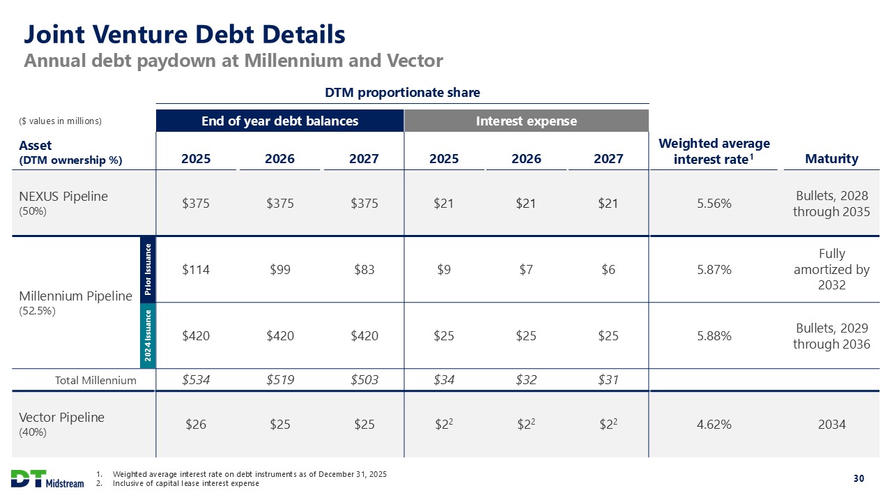 Weighted average interest rate on debt instruments as of December 31, 2025  Inclusive of capital lease interest expense  30  Joint Venture Debt Details  Annual debt paydown at Millennium and Vector  DTM proportionate share  End of year debt balances  Interest expense  Asset   (DTM ownership %)  2025  2026  2027  2025  2026  2027  Weighted average interest rate1  Maturity  NEXUS Pipeline   (50%)  $375  $375  $375  $21  $21  $21  5.56%  Bullets, 2028 through 2035  Millennium Pipeline  (52.5%)  $114  $99  $83  $9  $7  $6  5.87%  Fully amortized by 2032  $420  $420  $420  $25  $25  $25  5.88%  Bullets, 2029 through 2036   Total Millennium  $534  $519  $503  $34  $32  $31  Vector Pipeline  (40%)  $26  $25  $25  $22  $22  $22  4.62%  2034  2024 Issuance  Prior Issuance  ($ values in millions)