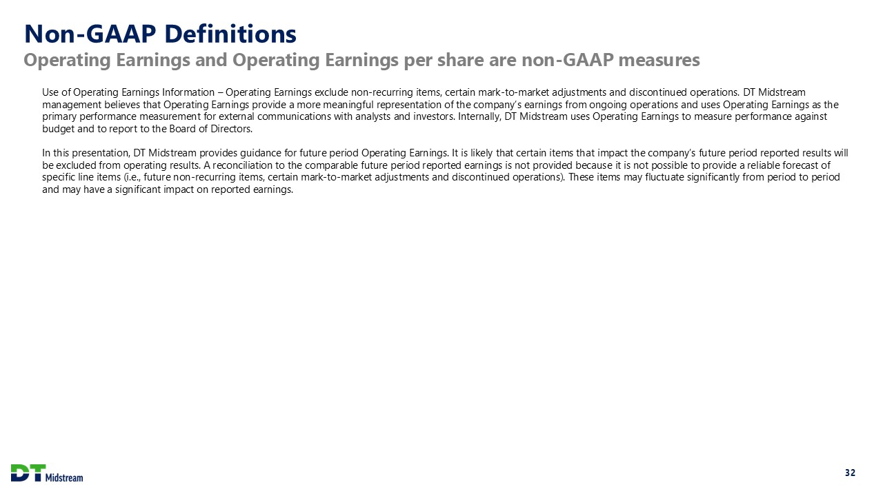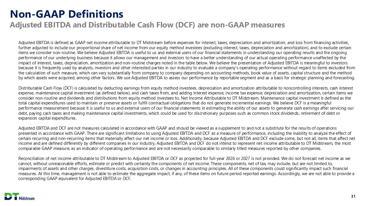 31  Non-GAAP Definitions  Adjusted EBITDA and Distributable Cash Flow (DCF) are non-GAAP measures  New slide  Adjusted EBITDA is defined as GAAP net income attributable to DT Midstream before expenses for interest, taxes, depreciation and amortization, and loss from financing activities, further adjusted to include our proportional share of net income from our equity method investees (excluding interest, taxes, depreciation and amortization), and to exclude certain items we consider non-routine. We believe Adjusted EBITDA is useful to us and external users of our financial statements in understanding our operating results and the ongoing performance of our underlying business because it allows our management and investors to have a better understanding of our actual operating performance unaffected by the impact of interest, taxes, depreciation, amortization and non-routine charges noted in the table below. We believe the presentation of Adjusted EBITDA is meaningful to investors because it is frequently used by analysts, investors and other interested parties in our industry to evaluate a company’s operating performance without regard to items excluded from the calculation of such measure, which can vary substantially from company to company depending on accounting methods, book value of assets, capital structure and the method by which assets were acquired, among other factors. We use Adjusted EBITDA to assess our performance by reportable segment and as a basis for strategic planning and forecasting.     Distributable Cash Flow (DCF) is calculated by deducting earnings from equity method investees, depreciation and amortization attributable to noncontrolling interests, cash interest expense, maintenance capital investment (as defined below), and cash taxes from, and adding interest expense, income tax expense, depreciation and amortization, certain items we consider non-routine and dividends and distributions from equity method investees to, Net Income Attributable to DT Midstream. Maintenance capital investment is defined as the total capital expenditures used to maintain or preserve assets or fulfill contractual obligations that do not generate incremental earnings. We believe DCF is a meaningful performance measurement because it is useful to us and external users of our financial statements in estimating the ability of our assets to generate cash earnings after servicing our debt, paying cash taxes and making maintenance capital investments, which could be used for discretionary purposes such as common stock dividends, retirement of debt or expansion capital expenditures.     Adjusted EBITDA and DCF are not measures calculated in accordance with GAAP and should be viewed as a supplement to and not a substitute for the results of operations presented in accordance with GAAP. There are significant limitations to using Adjusted EBITDA and DCF as a measure of performance, including the inability to analyze the effect of certain recurring and non-recurring items that materially affect our net income or loss. Additionally, because Adjusted EBITDA and DCF exclude some, but not all, items that affect net income and are defined differently by different companies in our industry, Adjusted EBITDA and DCF do not intend to represent net income attributable to DT Midstream, the most comparable GAAP measure, as an indicator of operating performance and are not necessarily comparable to similarly titled measures reported by other companies.  Reconciliation of net income attributable to DT Midstream to Adjusted EBITDA or DCF as projected for full-year 2026 or 2027 is not provided. We do not forecast net income as we cannot, without unreasonable efforts, estimate or predict with certainty the components of net income. These components, net of tax, may include, but are not limited to, impairments of assets and other charges, divestiture costs, acquisition costs, or changes in accounting principles. All of these components could significantly impact such financial measures. At this time, management is not able to estimate the aggregate impact, if any, of these items on future period reported earnings. Accordingly, we are not able to provide a corresponding GAAP equivalent for Adjusted EBITDA or DCF.