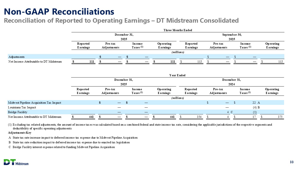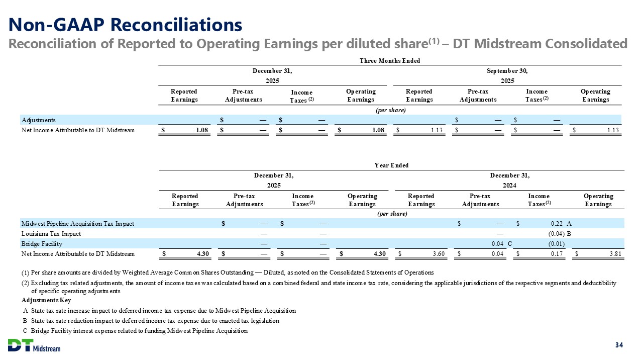 New slide  33  Non-GAAP Reconciliations  Reconciliation of Reported to Operating Earnings – DT Midstream Consolidated  Three Months Ended  December 31,  September 30,  2025  2025  Reported Earnings     Pre-tax Adjustments     Income Taxes (1)     Operating Earnings  Reported Earnings     Pre-tax Adjustments     Income Taxes (1)      Operating Earnings  (millions)  Adjustments  $ —   $ —   $ —   $ —   Net Income Attributable to DT Midstream     $ 111      $ —      $ —      $ 111      $ 115      $ —      $ —      $ 115   Year Ended  December 31,  December 31,  2025  2024  Reported Earnings     Pre-tax Adjustments     Income Taxes (1)     Operating Earnings  Reported Earnings     Pre-tax Adjustments     Income Taxes (1)     Operating Earnings  (millions)  Midwest Pipeline Acquisition Tax Impact  $ —   $ —   $ —   $ 22   A  Louisiana Tax Impact   —    —    —    (4)  B  Bridge Facility   —    —    4   C   (1)  Net Income Attributable to DT Midstream     $ 441      $ —   $ —      $ 441      $ 354      $ 4   $ 17      $ 375   (1)  Excluding tax related adjustments, the amount of income taxes was calculated based on a combined federal and state income tax rate, considering the applicable jurisdictions of the respective segments and deductibility of specific operating adjustments  Adjustments Key  A  State tax rate increase impact to deferred income tax expense due to Midwest Pipeline Acquisition  B  State tax rate reduction impact to deferred income tax expense due to enacted tax legislation  C  Bridge Facility interest expense related to funding Midwest Pipeline Acquisition