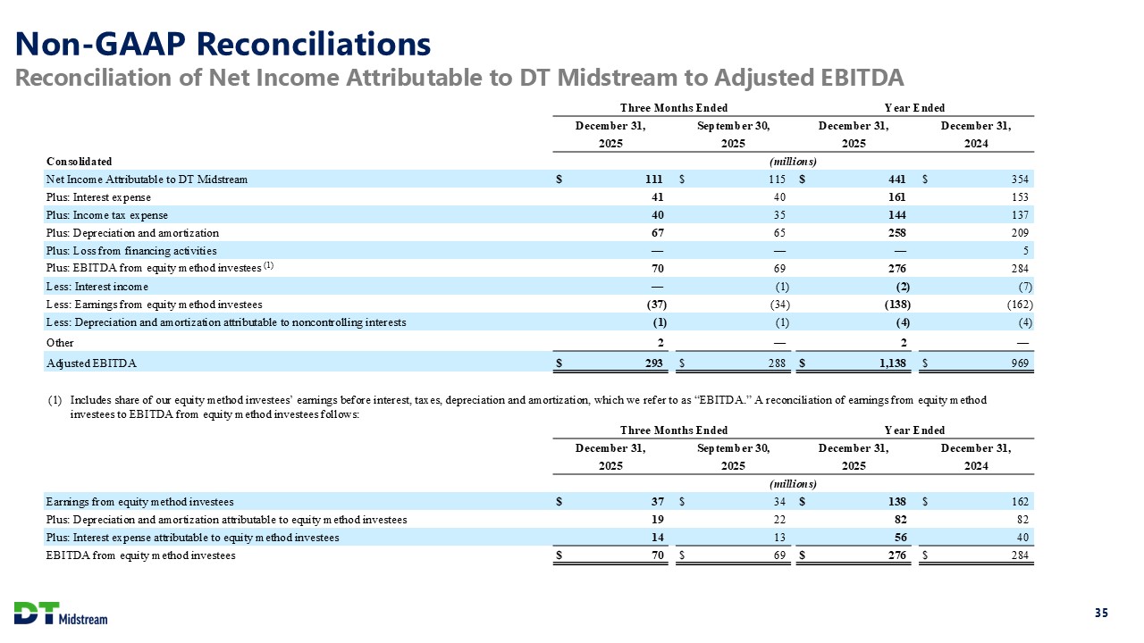 35     Reconciliation of Net Income Attributable to DT Midstream to Adjusted EBITDA  Non-GAAP Reconciliations  Three Months Ended  Year Ended  December 31,  September 30,  December 31,  December 31,  2025  2025  2025  2024  Consolidated  (millions)  Net Income Attributable to DT Midstream  $ 111   $ 115   $ 441   $ 354   Plus: Interest expense   41    40    161    153   Plus: Income tax expense   40    35    144    137   Plus: Depreciation and amortization   67    65    258    209   Plus: Loss from financing activities   —    —    —    5   Plus: EBITDA from equity method investees (1)   70    69    276    284   Less: Interest income   —    (1)   (2)   (7)  Less: Earnings from equity method investees   (37)   (34)   (138)   (162)  Less: Depreciation and amortization attributable to noncontrolling interests   (1)   (1)   (4)   (4)  Other   2    —    2    —   Adjusted EBITDA  $ 293   $ 288   $ 1,138   $ 969   (1)  Includes share of our equity method investees’ earnings before interest, taxes, depreciation and amortization, which we refer to as “EBITDA.” A reconciliation of earnings from equity method investees to EBITDA from equity method investees follows:  Three Months Ended  Year Ended  December 31,  September 30,  December 31,  December 31,  2025  2025  2025  2024  (millions)  Earnings from equity method investees  $ 37      $ 34   $ 138      $ 162   Plus: Depreciation and amortization attributable to equity method investees   19    22    82    82   Plus: Interest expense attributable to equity method investees   14    13    56    40   EBITDA from equity method investees  $ 70      $ 69   $ 276      $ 284