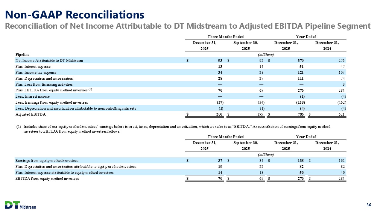 36  Reconciliation of Net Income Attributable to DT Midstream to Adjusted EBITDA Pipeline Segment  Non-GAAP Reconciliations  Three Months Ended  Year Ended  December 31,  September 30,  December 31,  December 31,  2025  2025  2025  2024  Pipeline  (millions)  Net Income Attributable to DT Midstream  $ 93   $ 92   $ 370    276   Plus: Interest expense   13    14    51    47   Plus: Income tax expense   34    28    121    107   Plus: Depreciation and amortization   28    27    111    74   Plus: Loss from financing activities   —    —    —    3   Plus: EBITDA from equity method investees (1)   70    69    276    284   Less: Interest income   —    —    (1)   (4)  Less: Earnings from equity method investees   (37)   (34)   (138)   (162)  Less: Depreciation and amortization attributable to noncontrolling interests   (1)   (1)   (4)   (4)  Adjusted EBITDA  $ 200   $ 195   $ 786   $ 621   (1)  Includes share of our equity method investees’ earnings before interest, taxes, depreciation and amortization, which we refer to as “EBITDA.” A reconciliation of earnings from equity method investees to EBITDA from equity method investees follows:  Three Months Ended  Year Ended  December 31,  September 30,  December 31,  December 31,  2025  2025  2025  2024  (millions)  Earnings from equity method investees  $ 37      $ 34   $ 138      $ 162   Plus: Depreciation and amortization attributable to equity method investees   19    22    82    82   Plus: Interest expense attributable to equity method investees   14    13    56    40   EBITDA from equity method investees  $ 70      $ 69   $ 276      $ 284