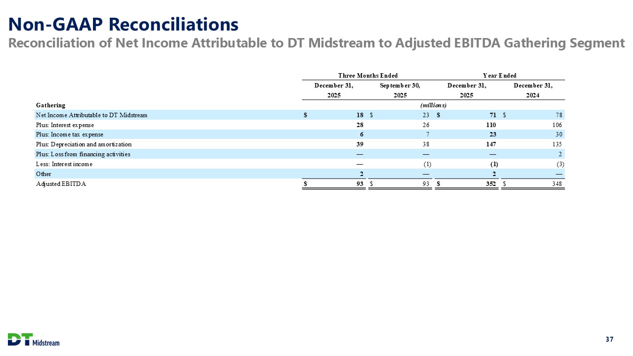 37  Reconciliation of Net Income Attributable to DT Midstream to Adjusted EBITDA Gathering Segment  Non-GAAP Reconciliations  Three Months Ended  Year Ended  December 31,  September 30,  December 31,  December 31,  2025  2025  2025  2024  Gathering  (millions)  Net Income Attributable to DT Midstream  $ 18   $ 23   $ 71   $ 78   Plus: Interest expense   28    26    110    106   Plus: Income tax expense   6    7    23    30   Plus: Depreciation and amortization   39    38    147    135   Plus: Loss from financing activities   —    —    —    2   Less: Interest income   —    (1)   (1)   (3)  Other   2    —    2    —   Adjusted EBITDA  $ 93   $ 93   $ 352   $ 348