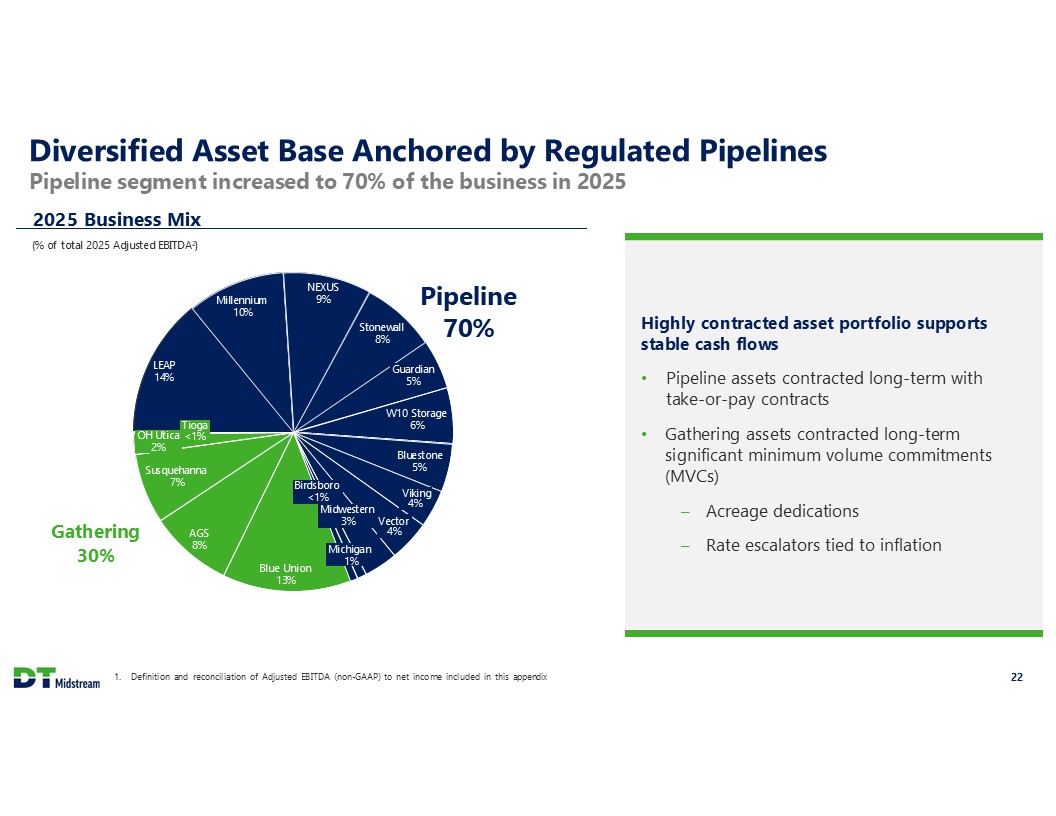 1. Definition and reconciliation of Adjusted EBITDA (non-GAAP) to net income included in this appendix  22  Diversified Asset Base Anchored by Regulated Pipelines  Pipeline segment increased to 70% of the business in 2025   2025 Business Mix   LEAP 14%  Millennium 10%  NEXUS 9%  Stonewall 8%  Guardian 5%  W10 Storage 6%  Bluestone 5%  Viking  4%  4%  Midwestern  Vector  3%  Michigan 1%  Birdsboro  <1%  Blue Union 13%  AGS 8%  Susquehanna 7%  2%  Tioga  OH Utica <1%  (% of total 2025 Adjusted EBITDA2)  Highly contracted asset portfolio supports stable cash flows  Pipeline assets contracted long-term with take-or-pay contracts  Gathering assets contracted long-term significant minimum volume commitments (MVCs)  Acreage dedications  Rate escalators tied to inflation  Gathering 30%  Pipeline 70%
