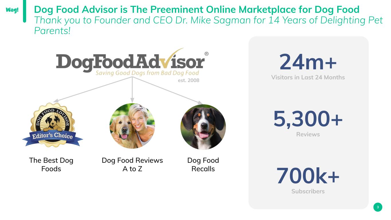 2 Pet Food & Treats Pet Food Pet Treats Wellness 24/7 Expert Vet Advice Compare Pet Insurance Wellness Plans Services Walking Drop-In Sitting Boarding Training Wag! Premium ● 10% Off All Services ● Exclusive Benefits Center ● 24/7 VIP Support 2 2023 Platform Expansion Entering $50B Pet Food & Treat Category with acquisition¹ of DogFoodAdvisor.com 1. Subject to customary closing conditions. Expected to close first quarter of 2023. 2. Source: American Pet Products Association (“APPA”) – Actual Sales within the U.S. Market in 2021. 3. The “Wellness” category equates to the APPA “Vet Care & Product Sales” market category. Furmacy Prescription RX $50B TAM² $34B³ $10B