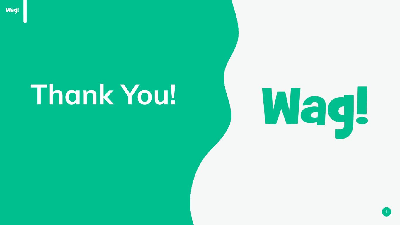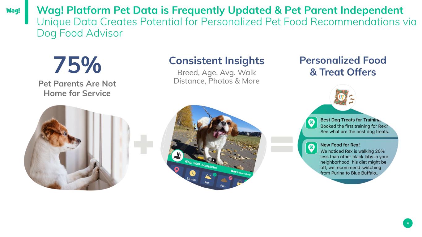 4 Wag! Platform Pet Data is Frequently Updated & Pet Parent Independent Unique Data Creates Potential for Personalized Pet Food Recommendations via Dog Food Advisor 75% Pet Parents Are Not Home for Service Personalized Food & Treat Offers Consistent Insights Breed, Age, Avg. Walk Distance, Photos & More