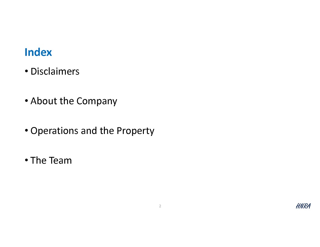 Index • Disclaimers • About the Company • Operations and the Property • The Team 2