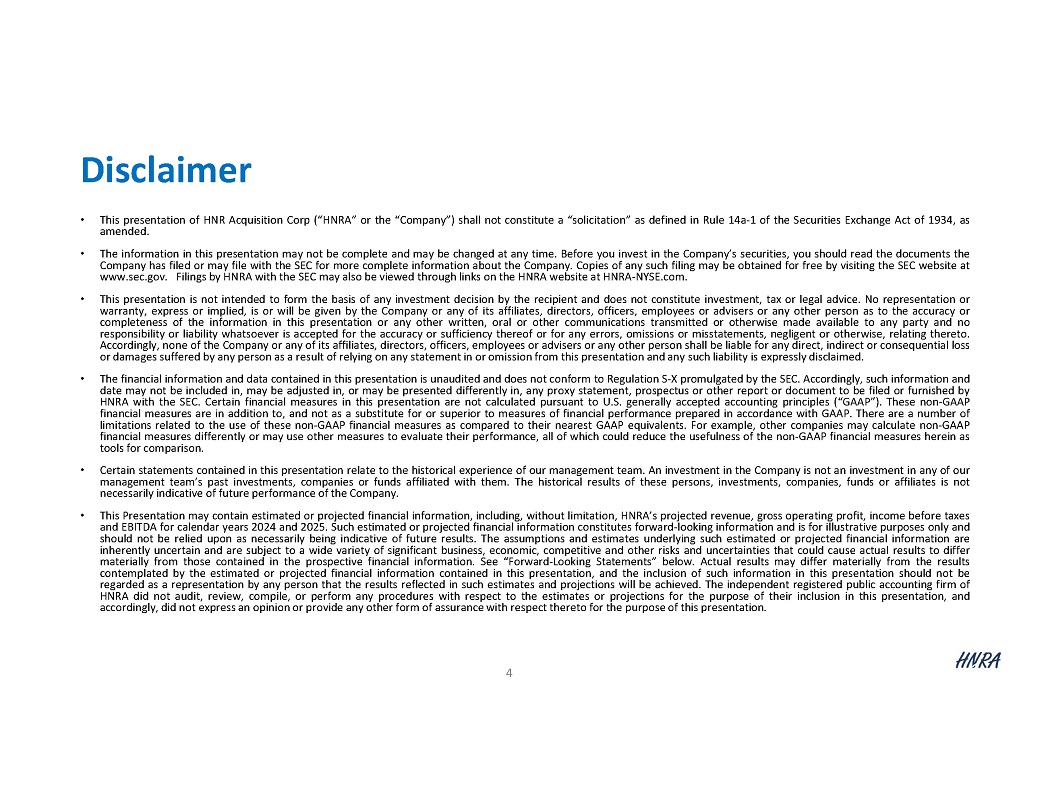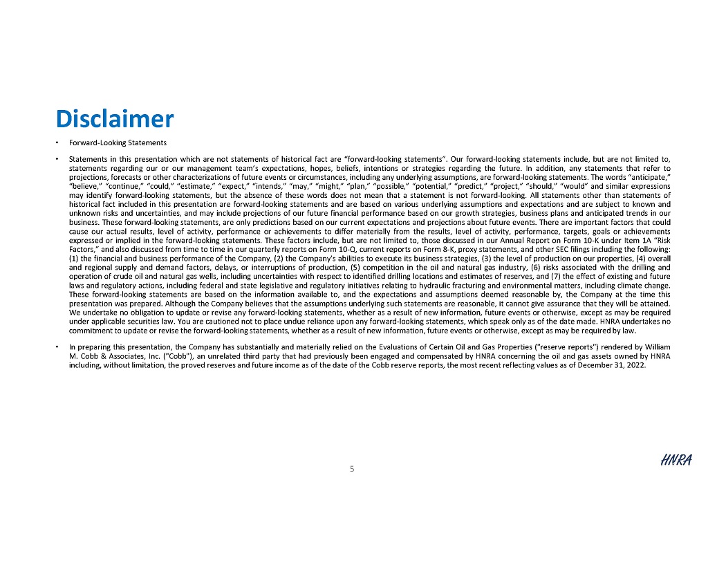 Disclaimer • This presentation of HNR Acquisition Corp (“HNRA” or the “Company”) shall not constitute a “solicitation” as defined in Rule 14 a - 1 of the Securities Exchange Act of 1934 , as amended . • The information in this presentation may not be complete and may be changed at any time . Before you invest in the Company’s securities, you should read the documents the Company has filed or may file with the SEC for more complete information about the Company . Copies of any such filing may be obtained for free by visiting the SEC website at www . sec . gov . Filings by HNRA with the SEC may also be viewed through links on the HNRA website at HNRA - NYSE . com . • This presentation is not intended to form the basis of any investment decision by the recipient and does not constitute investment, tax or legal advice . No representation or warranty, express or implied, is or will be given by the Company or any of its affiliates, directors, officers, employees or advisers or any other person as to the accuracy or completeness of the information in this presentation or any other written, oral or other communications transmitted or otherwise made available to any party and no responsibility or liability whatsoever is accepted for the accuracy or sufficiency thereof or for any errors, omissions or misstatements, negligent or otherwise, relating thereto . Accordingly, none of the Company or any of its affiliates, directors, officers, employees or advisers or any other person shall be liable for any direct, indirect or consequential loss or damages suffered by any person as a result of relying on any statement in or omission from this presentation and any such liability is expressly disclaimed . • The financial information and data contained in this presentation is unaudited and does not conform to Regulation S - X promulgated by the SEC . Accordingly, such information and date may not be included in, may be adjusted in, or may be presented differently in, any proxy statement, prospectus or other report or document to be filed or furnished by HNRA with the SEC . Certain financial measures in this presentation are not calculated pursuant to U . S . generally accepted accounting principles (“GAAP”) . These non - GAAP financial measures are in addition to, and not as a substitute for or superior to measures of financial performance prepared in accordance with GAAP . There are a number of limitations related to the use of these non - GAAP financial measures as compared to their nearest GAAP equivalents . For example, other companies may calculate non - GAAP financial measures differently or may use other measures to evaluate their performance, all of which could reduce the usefulness of the non - GAAP financial measures herein as tools for comparison . • Certain statements contained in this presentation relate to the historical experience of our management team . An investment in the Company is not an investment in any of our management team’s past investments, companies or funds affiliated with them . The historical results of these persons, investments, companies, funds or affiliates is not necessarily indicative of future performance of the Company . • This Presentation may contain estimated or projected financial information, including, without limitation, HNRA’s projected revenue, gross operating profit, income before taxes and EBITDA for calendar years 2024 and 2025 . Such estimated or projected financial information constitutes forward - looking information and is for illustrative purposes only and should not be relied upon as necessarily being indicative of future results . The assumptions and estimates underlying such estimated or projected financial information are inherently uncertain and are subject to a wide variety of significant business, economic, competitive and other risks and uncertainties that could cause actual results to differ materially from those contained in the prospective financial information . See “Forward - Looking Statements” below . Actual results may differ materially from the results contemplated by the estimated or projected financial information contained in this presentation, and the inclusion of such information in this presentation should not be regarded as a representation by any person that the results reflected in such estimates and projections will be achieved . The independent registered public accounting firm of HNRA did not audit, review, compile, or perform any procedures with respect to the estimates or projections for the purpose of their inclusion in this presentation, and accordingly, did not express an opinion or provide any other form of assurance with respect thereto for the purpose of this presentation . 4